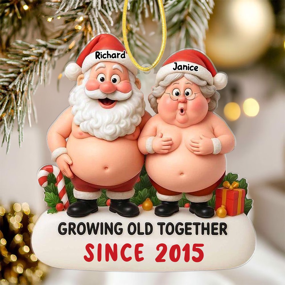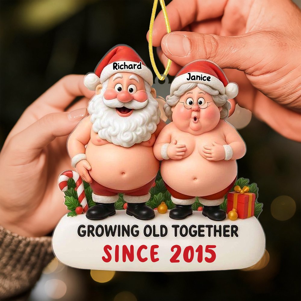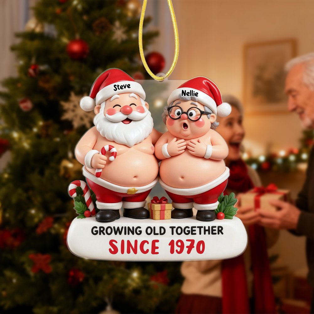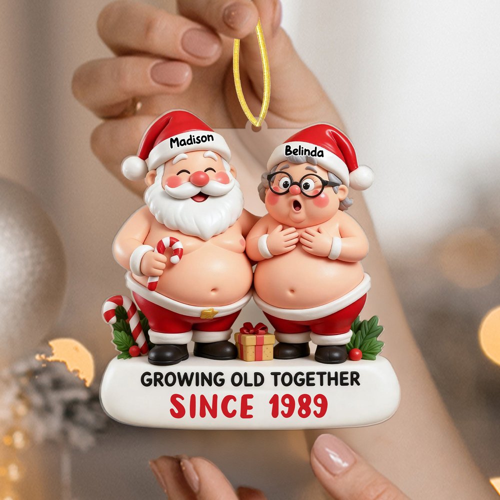 This acrylic ornament features a "Funny Couple" theme, creating a Christmas-themed design with exposed bodies and cute Santa hat elements, exuding a whimsical and warm holiday atmosphere. Customization with a couple of names and commemorative years is available. The overall design is simple yet dynamic, with a lively and playful cartoon style that highlights the Christmas spirit while conveying the sweet interaction between couples.