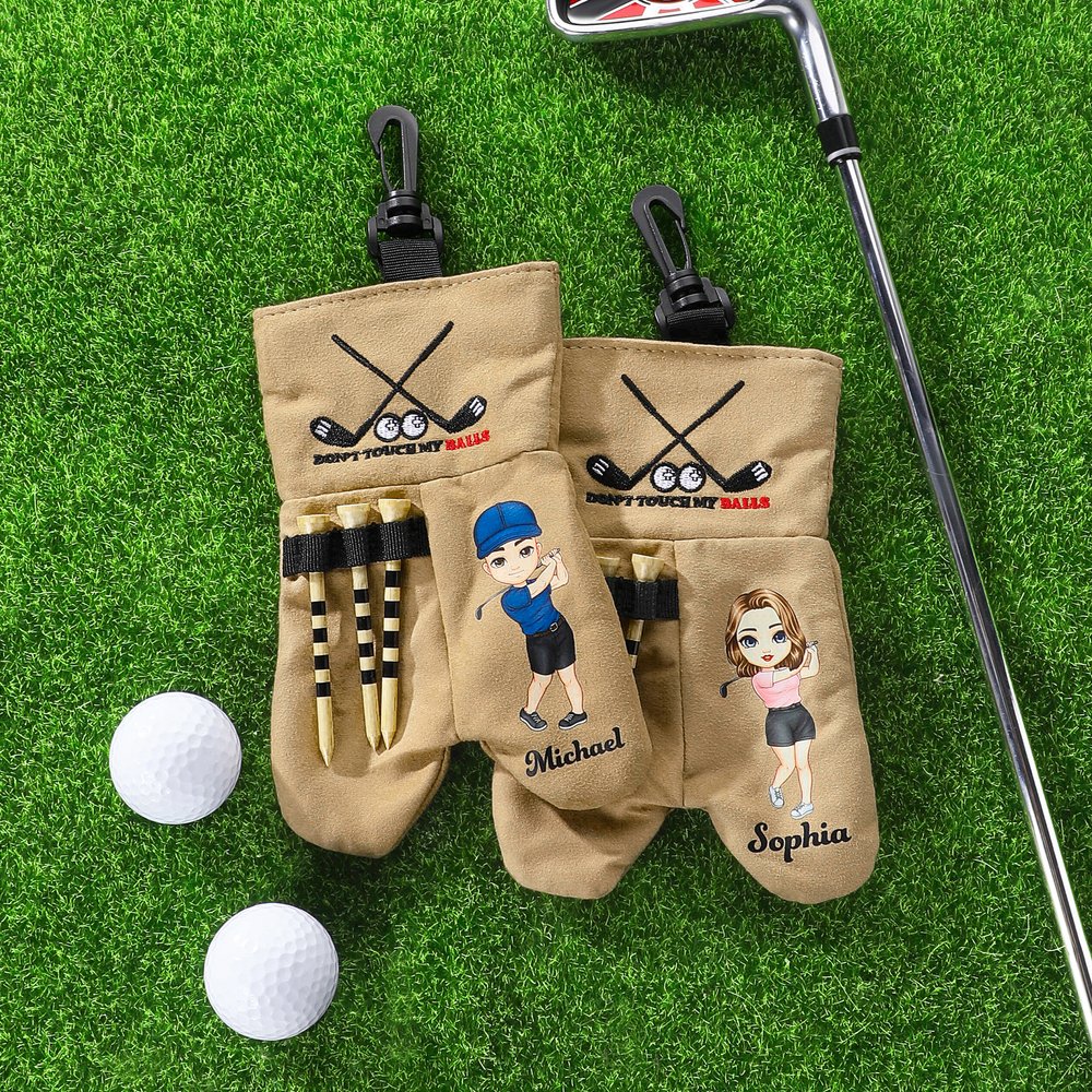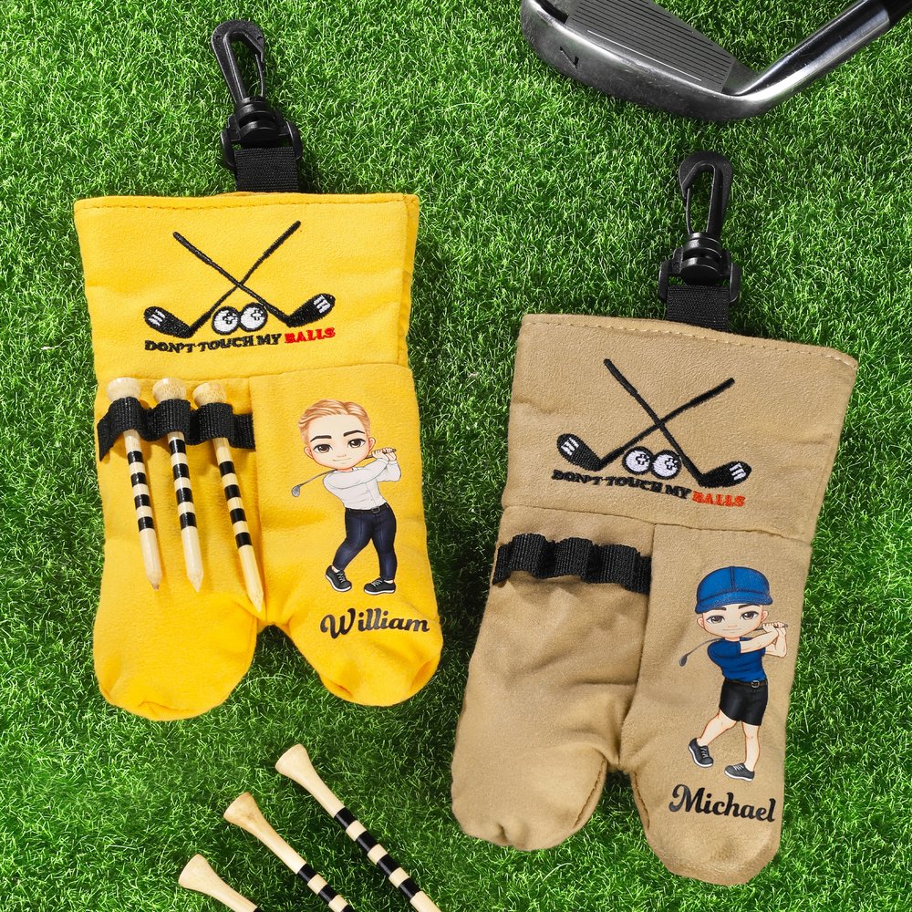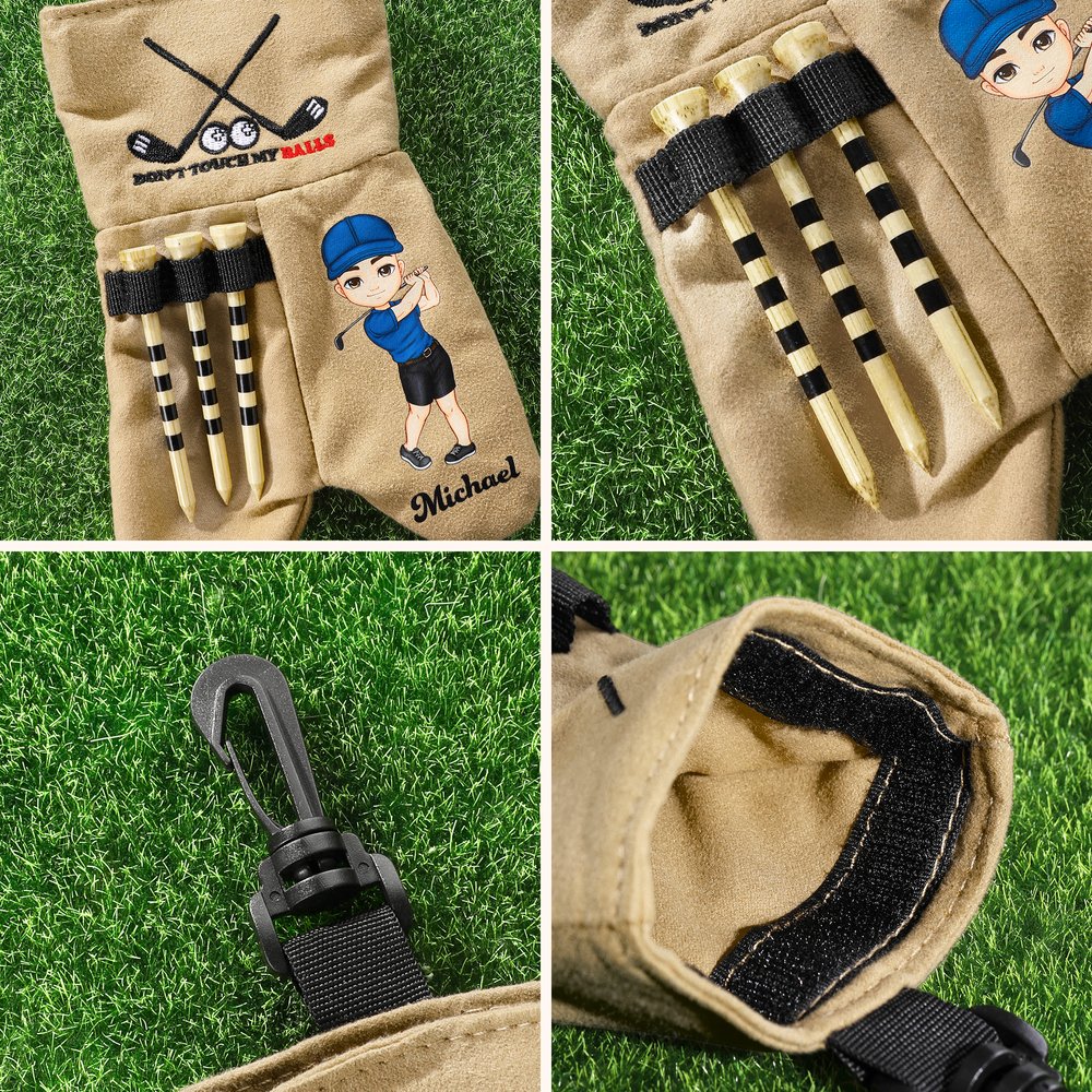 This golf ball bag offers extensive customization. You can choose between light coffee and yellow colours. Then, personalize the cartoon character images swinging a golf club. You can also add a name to make it unique. The top “DON'T TOUCH MY BALLS” text adds a fun touch, making each bag uniquely yours.