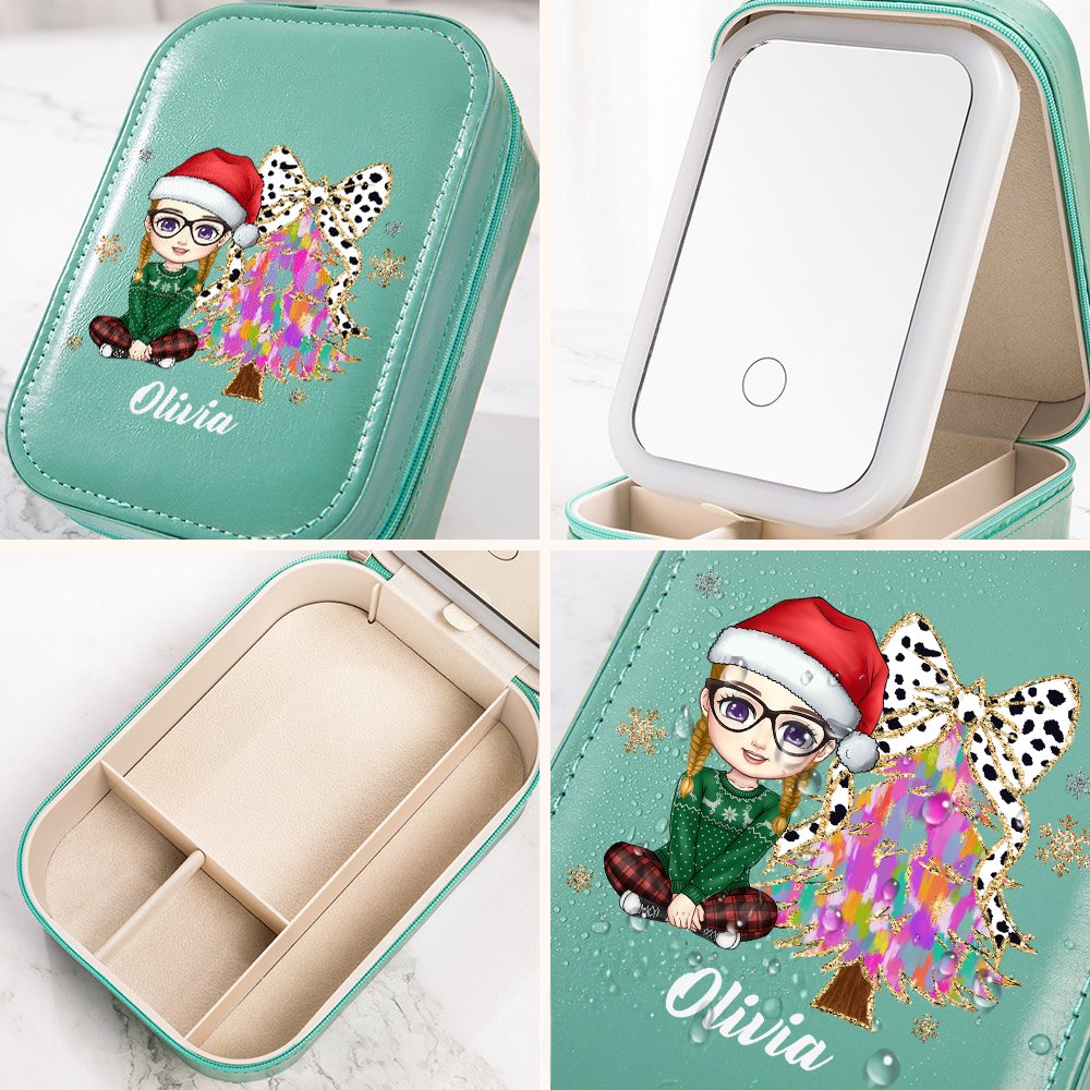 Personalized Cartoon Faux Glitter Christmas Tree Leather Jewellery Box with LED Three-colour Adjustable Makeup Mirror Birthday Gift for Family