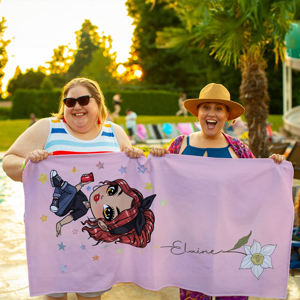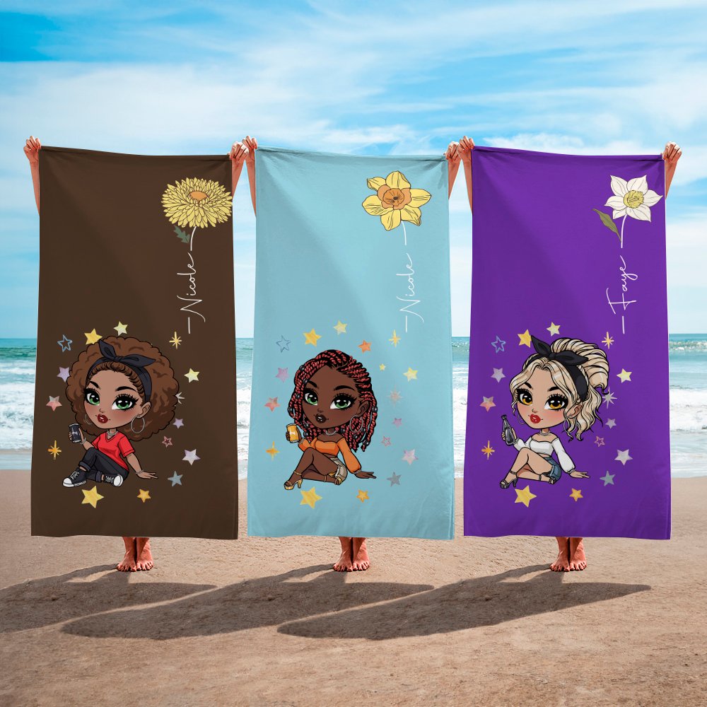 This beach towel features a stylish cartoon girl and is adorned with a beautiful birth flower, showing a unique personality charm. A custom name is supported on the beach towel to create unique souvenirs.
