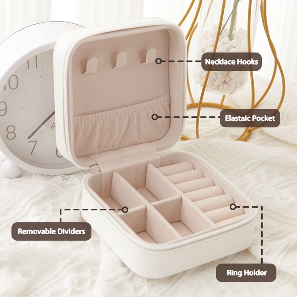 Made of PU leather. It’s easy to clean and compact enough to fit in your bag while providing ample storage for your precious accessories. Designed with multiple compartments, this jewellery box keeps your necklaces, rings, bracelets, and earrings neatly organized. The smooth zipper closure ensures your jewellery stays secure during travel.
