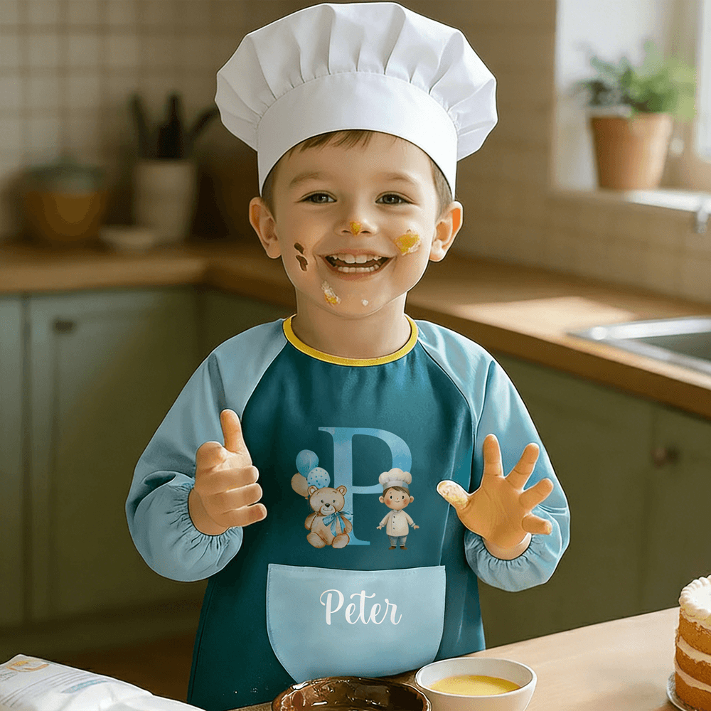 This kids' apron offers full personalization. Choose a custom initial, adorable cartoon profession character, and add your child’s name to create a one-of-a-kind apron. The playful design, featuring balloon elements, is made to appeal to kids, making it not only a protective apron but also a fun and personalized item that encourages creativity.