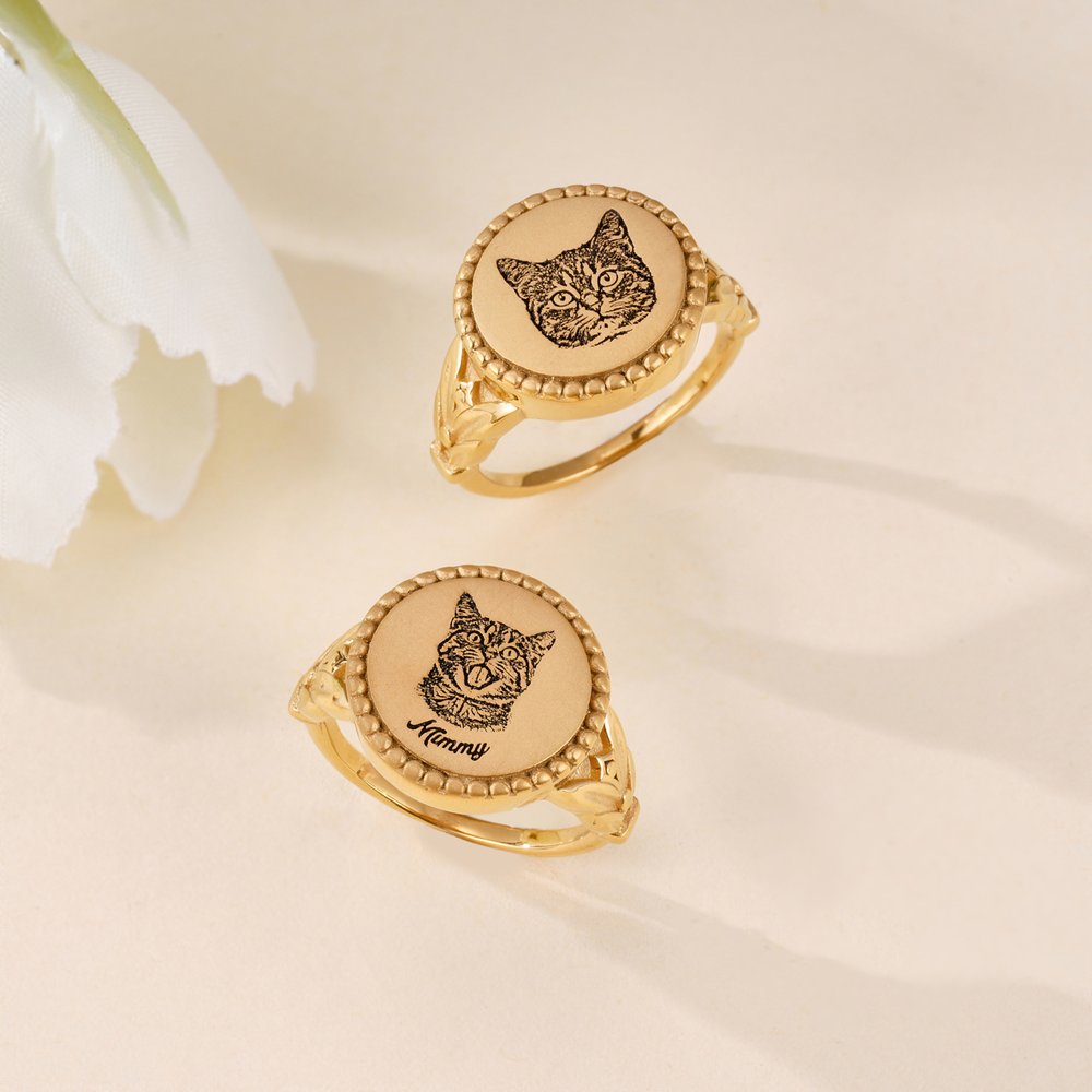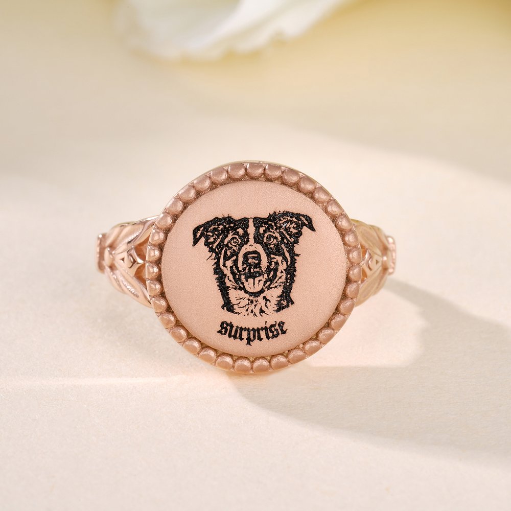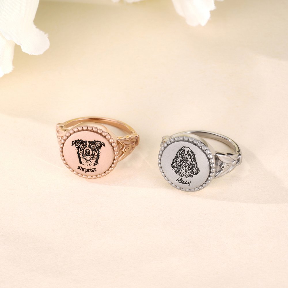 This is not just a ring; it's a wearable "portrait". Through our meticulous customization process, we permanently engrave the unique and adorable portrait and name of your beloved pet onto the ring face. Whether it's a playful tongue-out or a gentle gaze, every detail is carefully reproduced, bringing your cherished image from a photo into real life and transforming it into a piece of affectionate art jewellery that sparkles on your finger at all times.