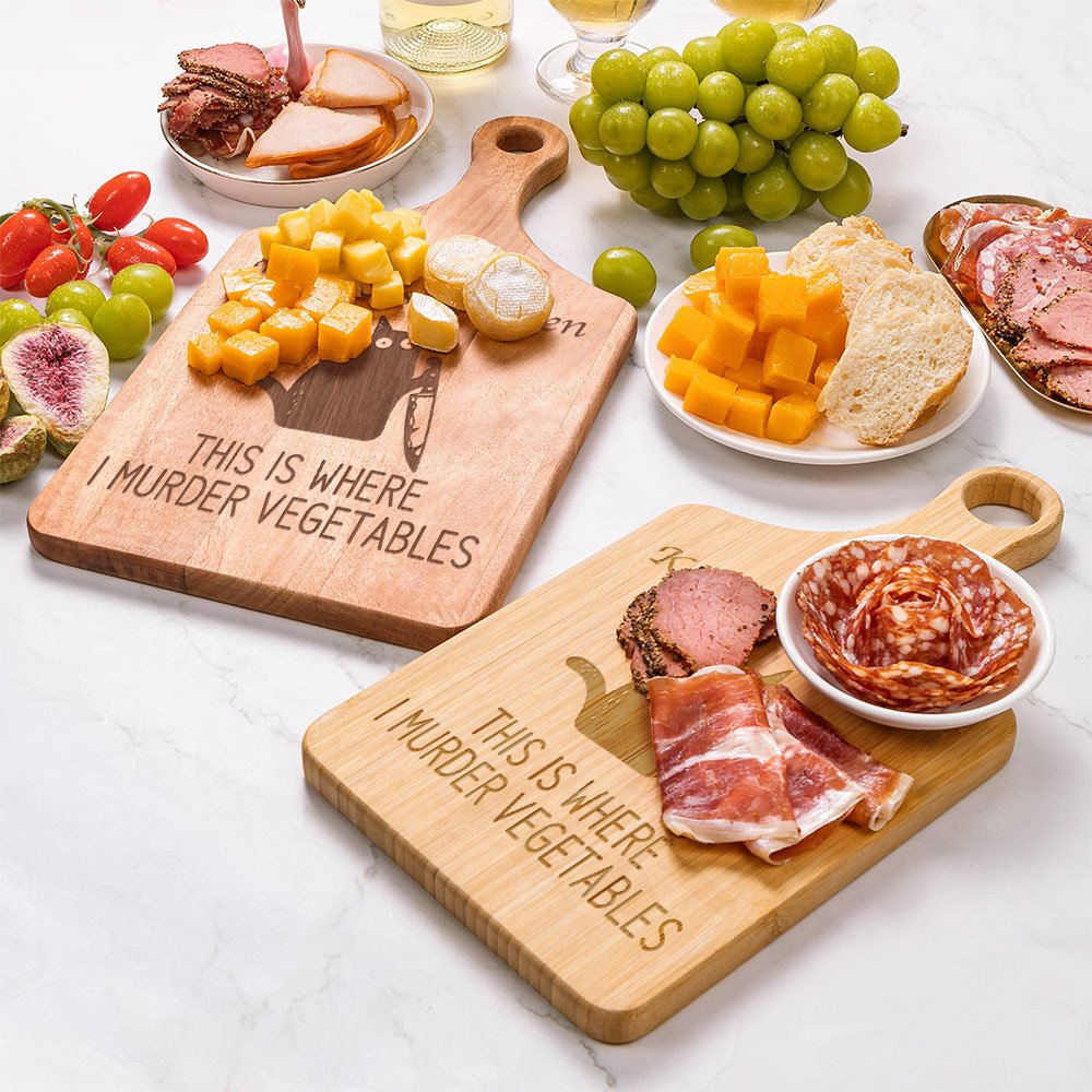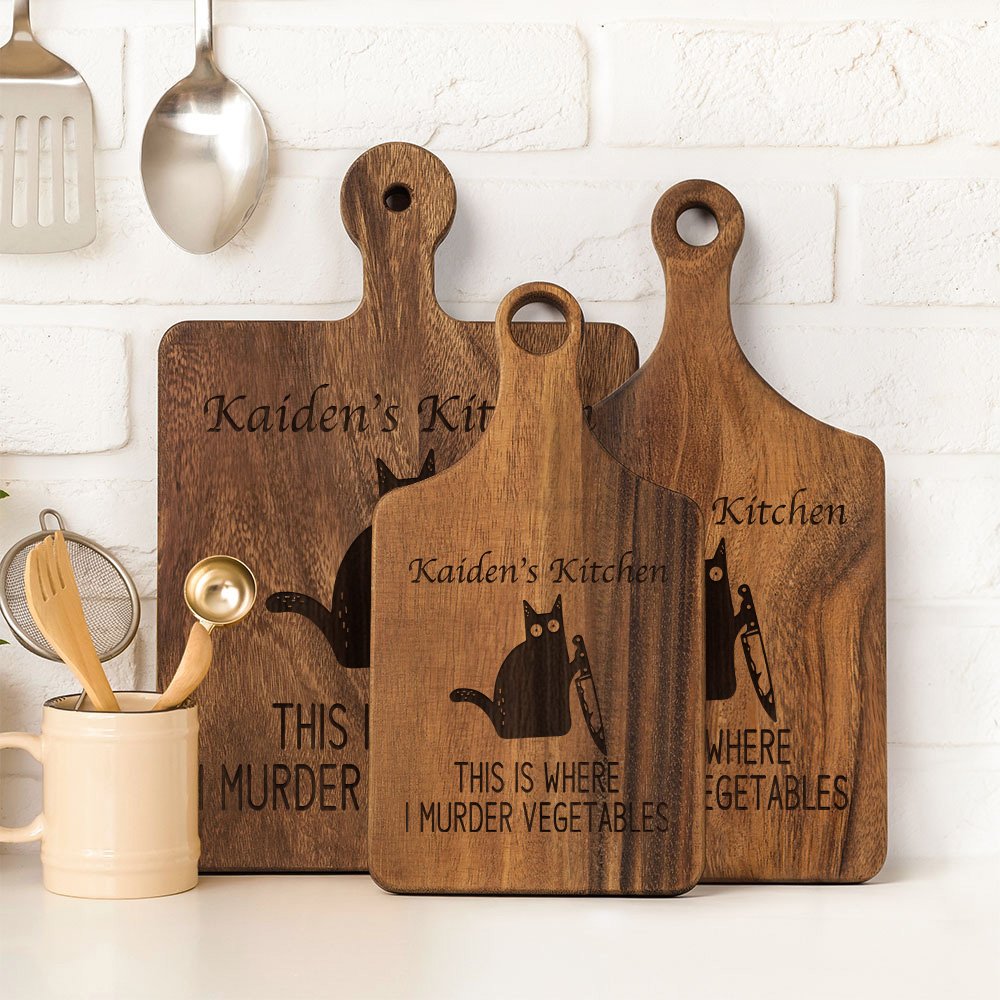 Our cutting board features a cute and fun black cat killer design. For added humor, you can choose the text "This is where I murder vegetables" or "I murder vegetables." You can also add Personalized text to make the board genuinely unique.