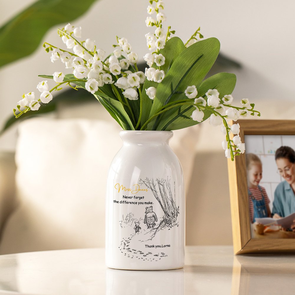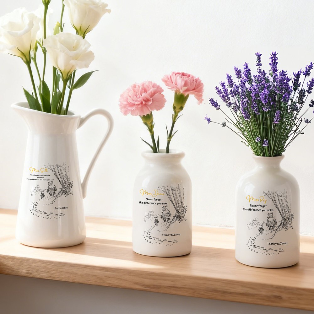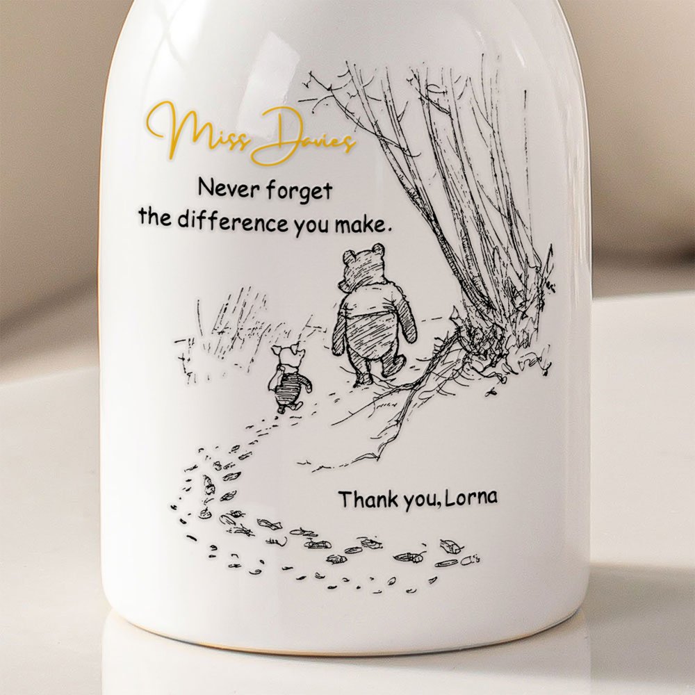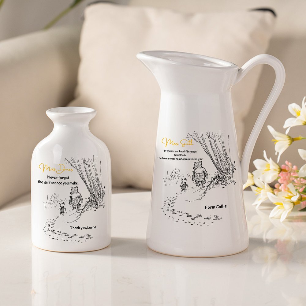 This vase features the beloved classic Winnie the Pooh, created by the renowned author A. A. Milne, which has captured the hearts of generations. And it is also customizable text and name. It turns a vase into a unique, sentimental gift that speaks directly to your appreciation.