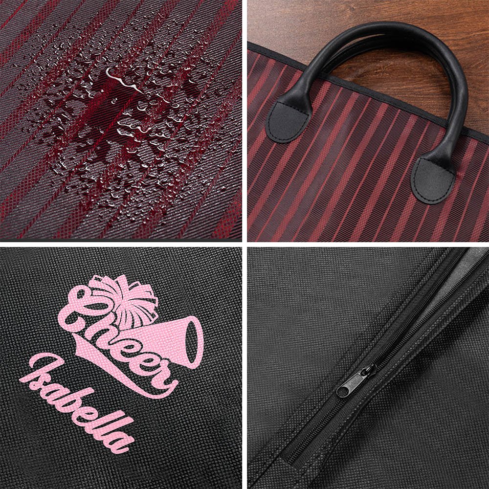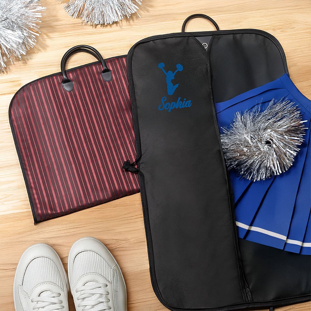 Featuring a special cheerleading graphic design and a customizable name, this garment bag is designed specifically for cheerleading girls. The striped design is simple and individual. When hanging, it can perfectly show the design of the front of the bag, allowing you to show your personality and taste on any occasion.
