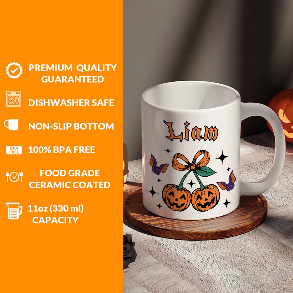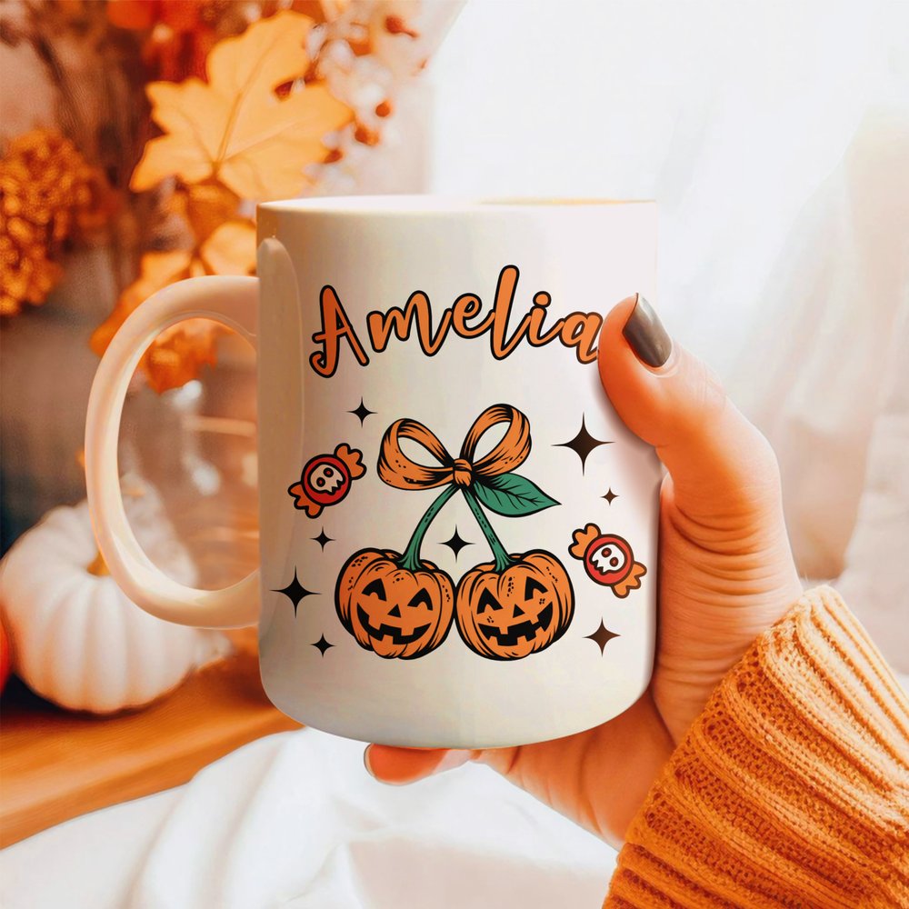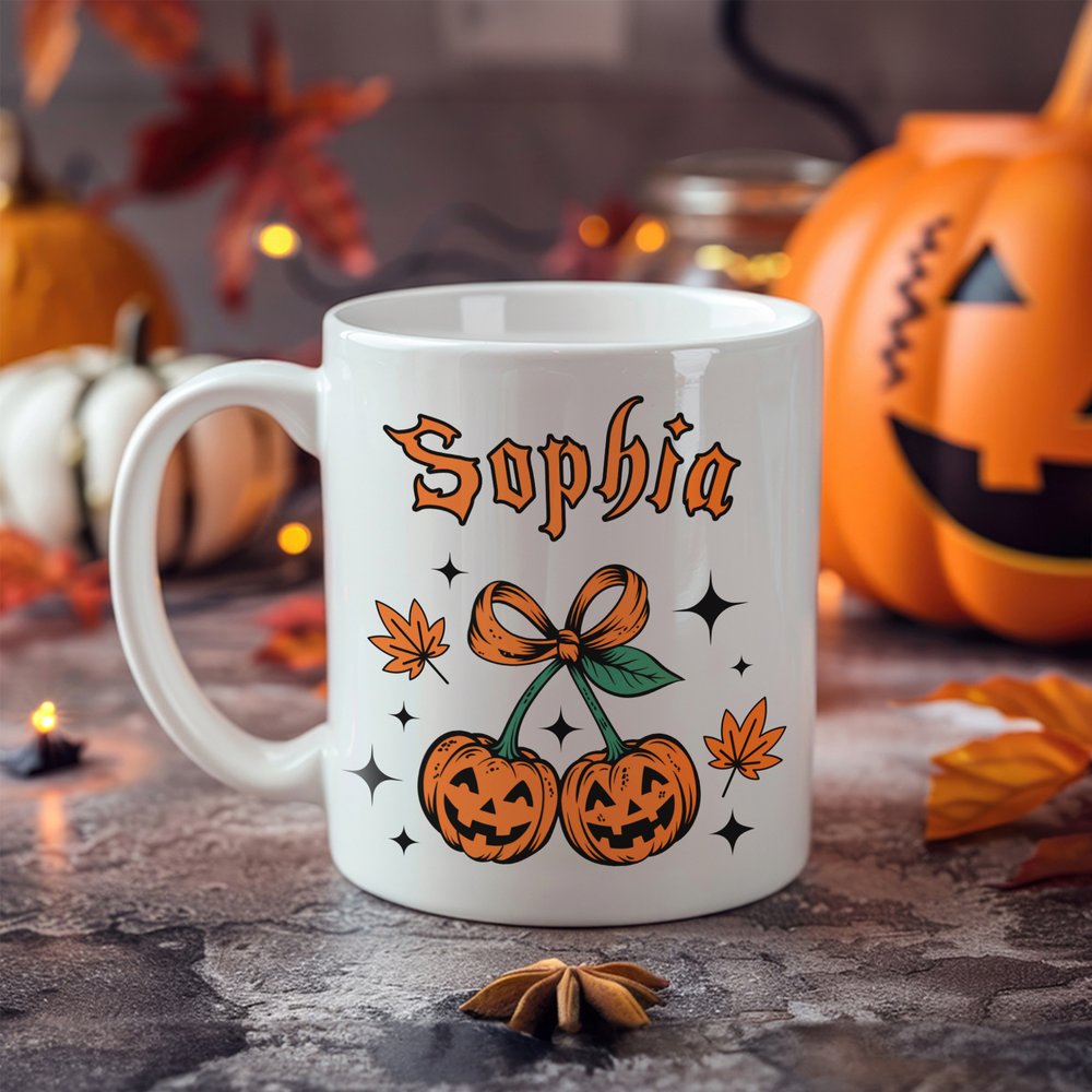 Centreed around the cherry pumpkin theme, 11 Halloween-themed icons like pumpkins, bats, and skulls are available. Additionally, there are 3 font styles to select from, and you can input a custom name. Each mug becomes a one - of - a - kind item with your personalized touches.