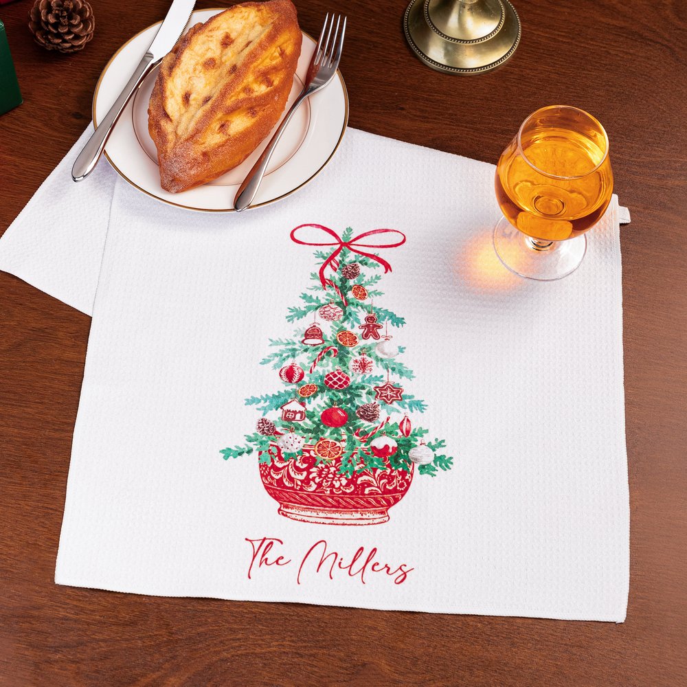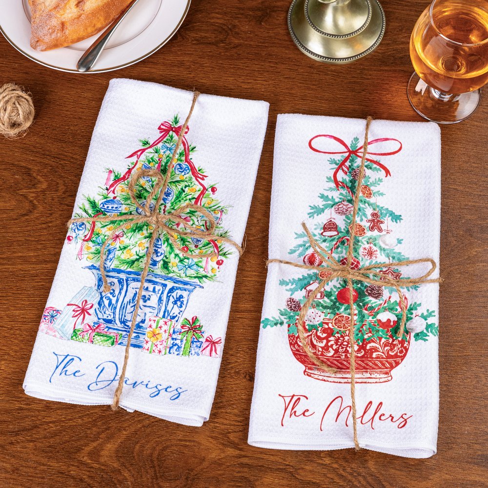 Brighten your kitchen with a tea towel featuring a Christmas tree set in vibrant red and blue flowerpots, decorated with ribbons, gifts, and classic holiday accents. This charming design brings festive cheer to any space, turning everyday chores into joyful seasonal moments.