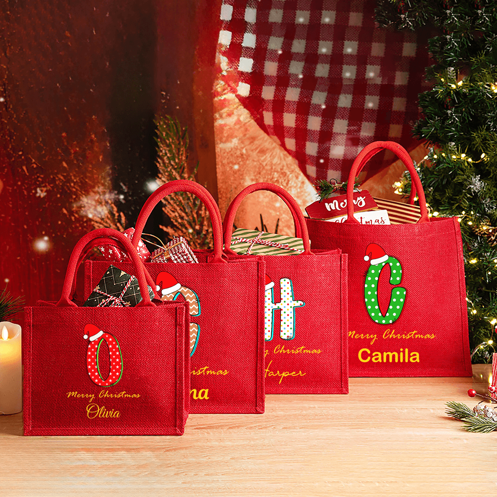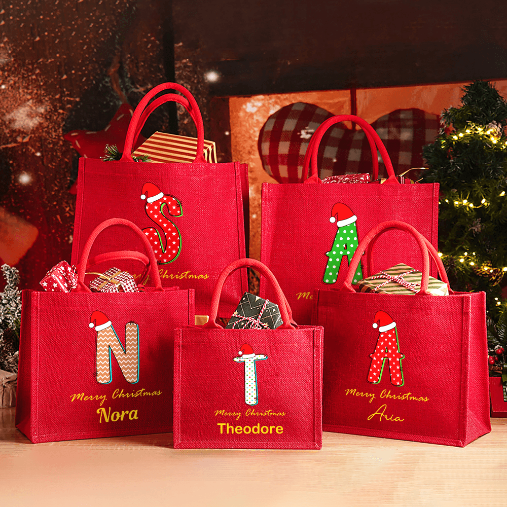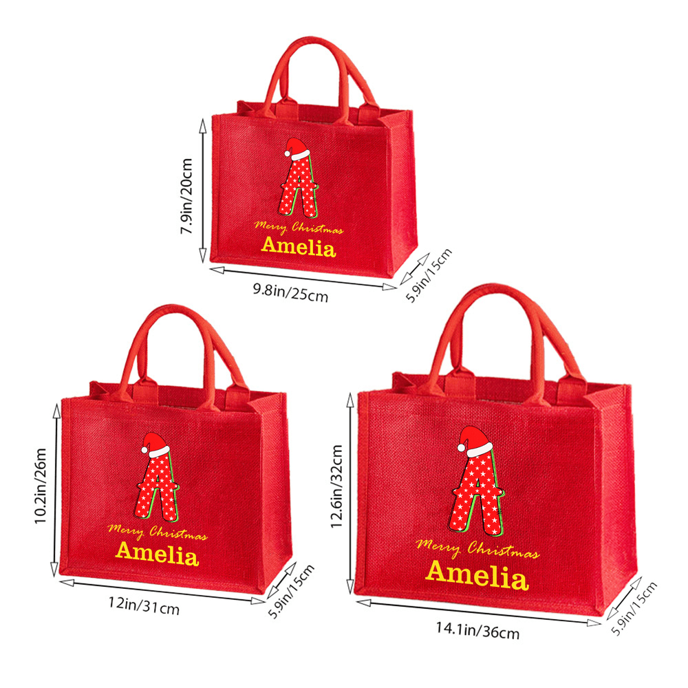 Personalized Christmas Hat Initial Large Jute Tote Bag with Name Christmas Party Gift for Kids Family Friends