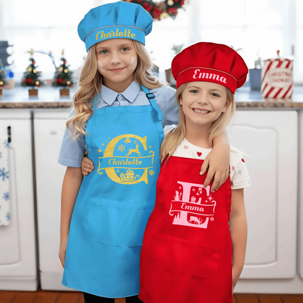 This apron features festive Christmas letters and the option to customize with your child's name, creating a fun and personalized cooking experience. Available in vibrant colours, it adds a cheerful touch to any kitchen activity, making culinary tasks even more exciting for children.