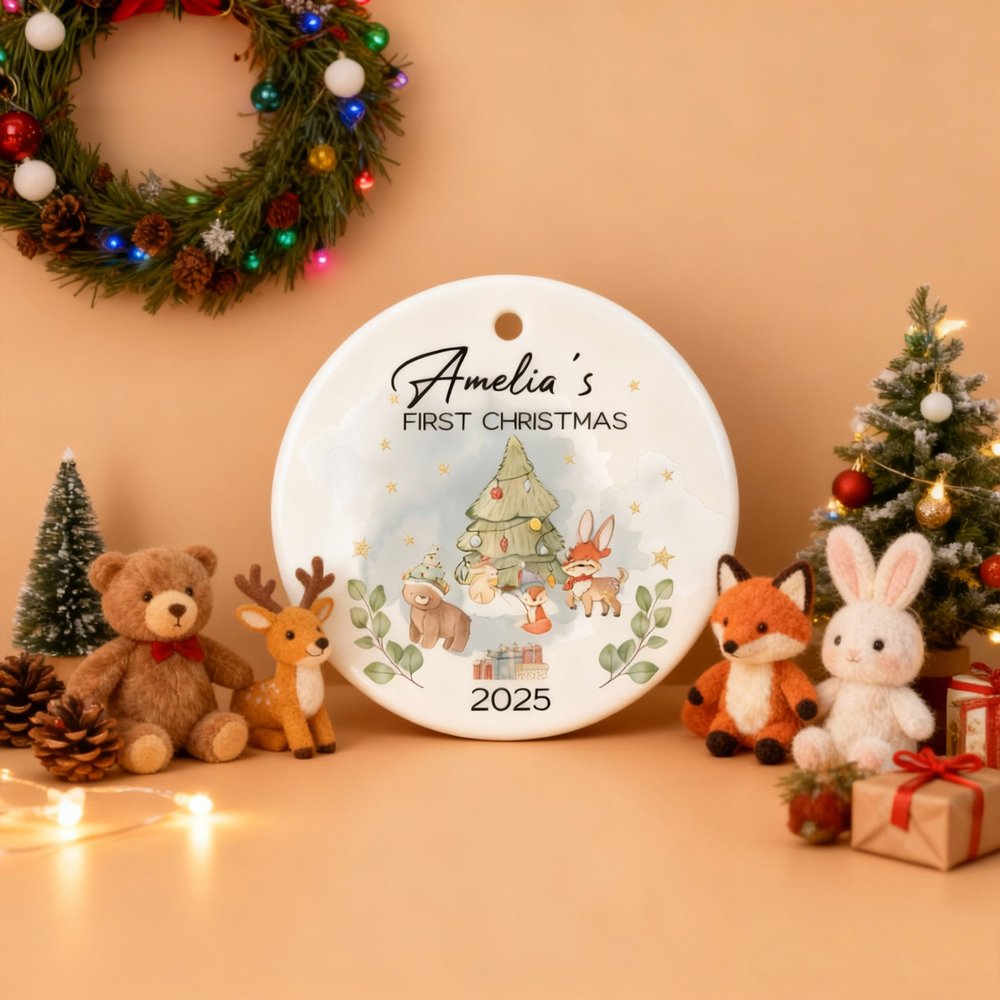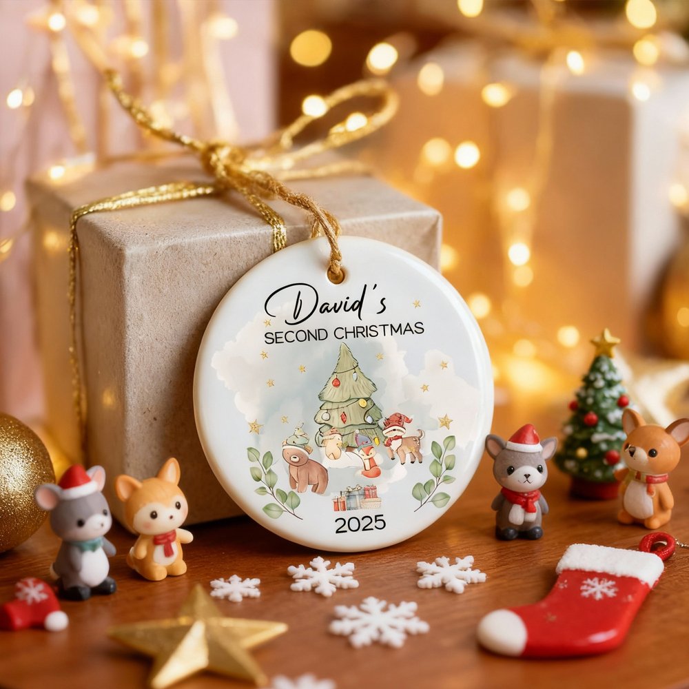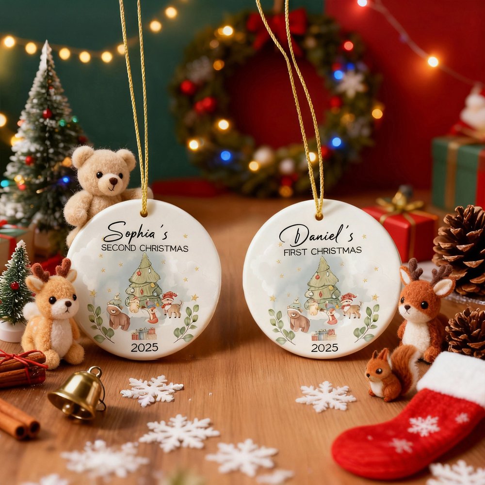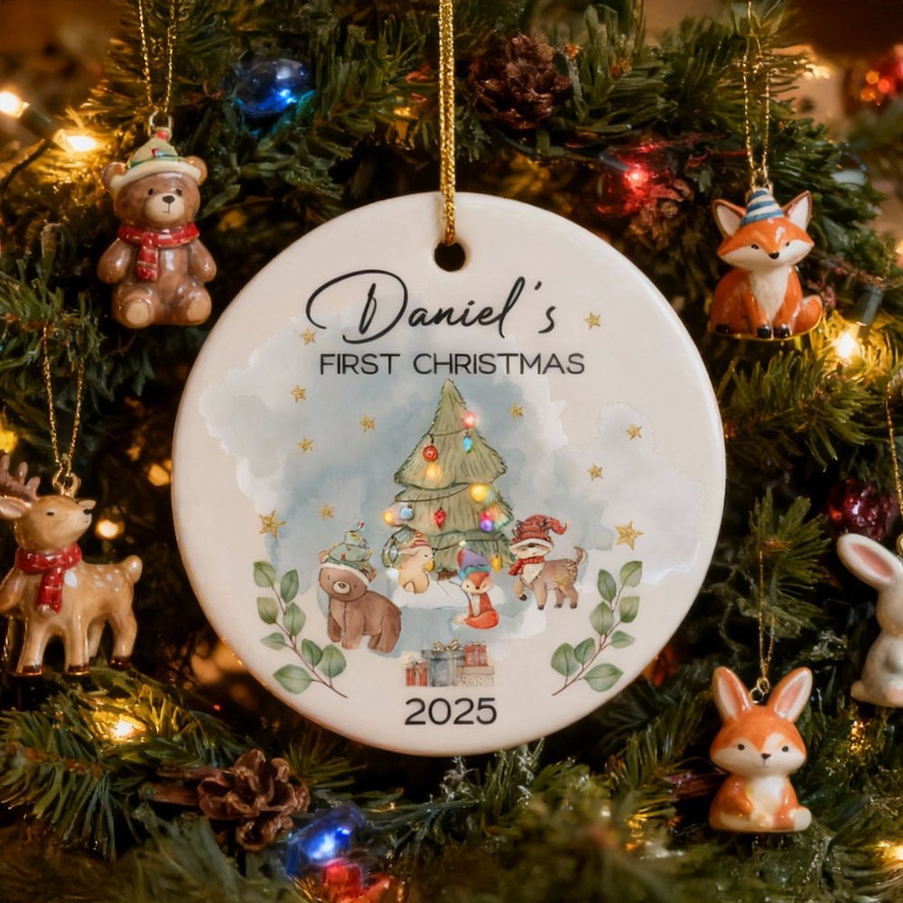 Personalized Cute Christmas Tree Cartoon Animals Ceramic Christmas Ornament with Name First Second Christmas Decor Gift for Baby Kids