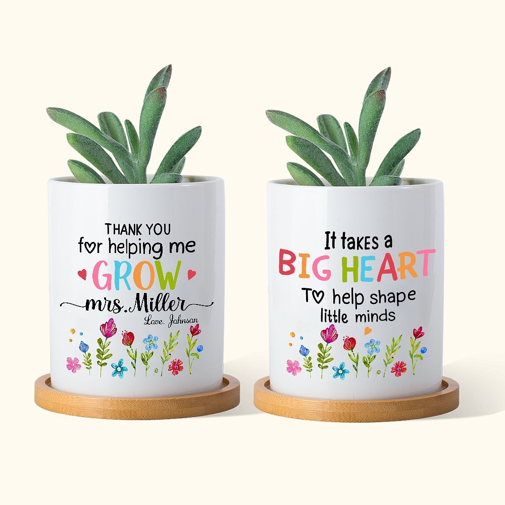 Our flower pot features the warming texts "Thank you for helping me grow" and "It takes a big heart to help shape little minds." With the option to add the recipient's name, this Personalized item beautifully captures the dedication of teachers and serves as a heartfelt appreciation for them.