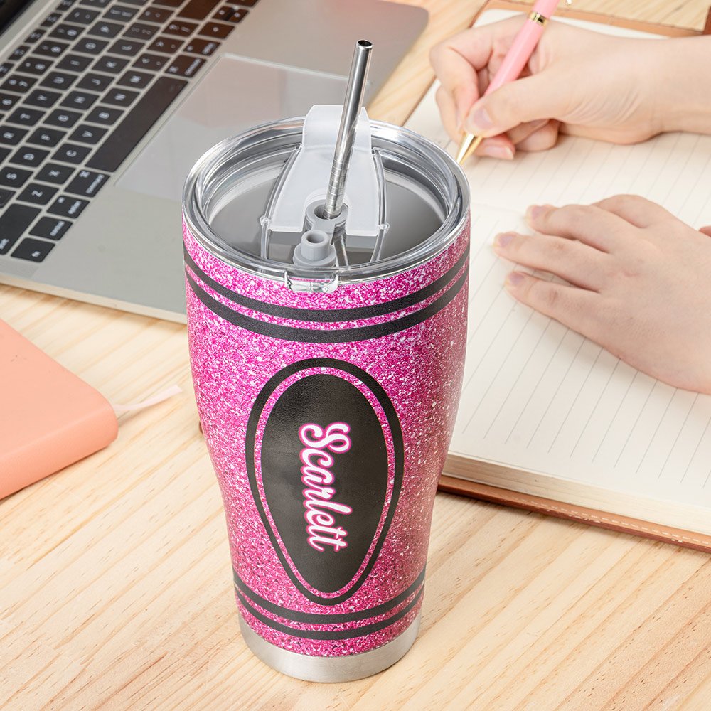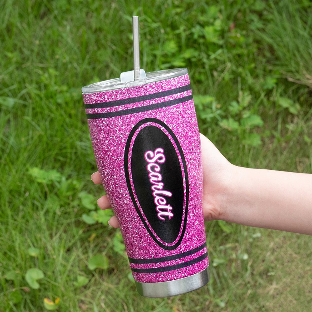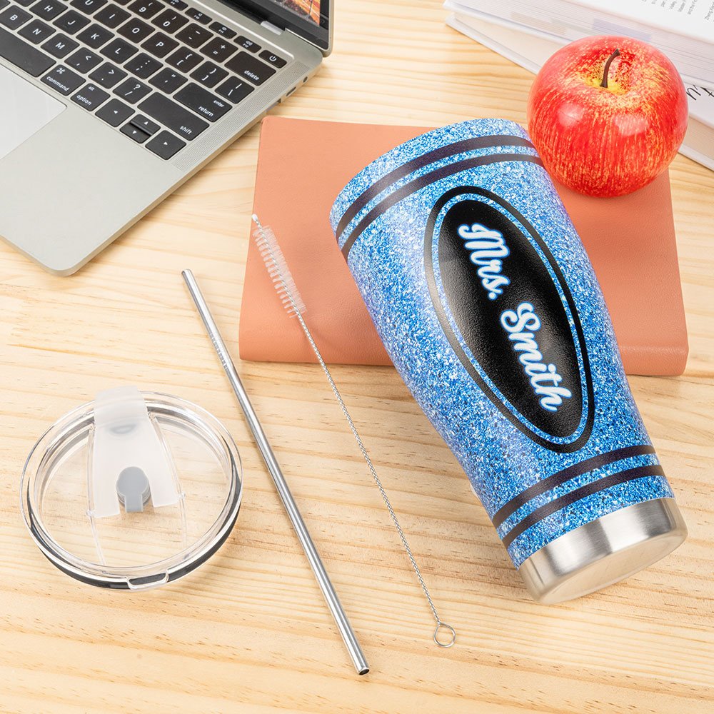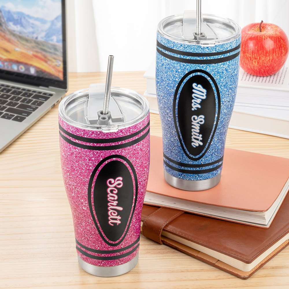 Inspired by coloured crayons, this 30oz curved glass combines the dazzling appeal of glitter design and is available in eight colours. The possibility of having a teacher's name customized on the tumbler body makes each piece unique and thoughtful.