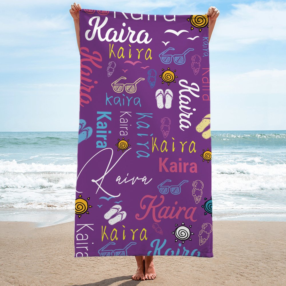 This beach towel features summer patterns, including various artistic characters, sunglasses, seagulls, the sun, and more. These fresh and cute patterns add a touch of summer color to the beach towel. Beach towels also have a variety of color options, including bright summer colors and fresh and elegant tones, to meet the preferences and needs of different people. You can also customize the name on the beach towel according to your requirements to make it even more unique.
