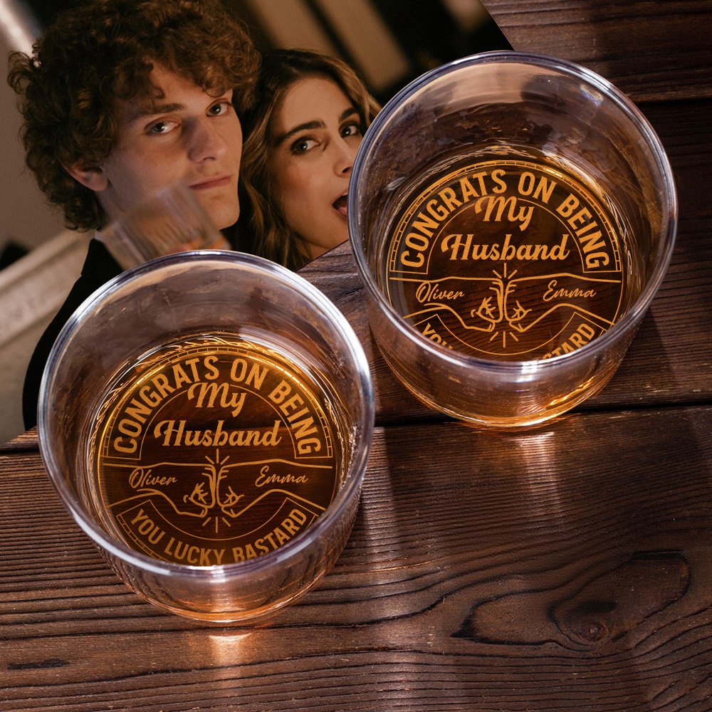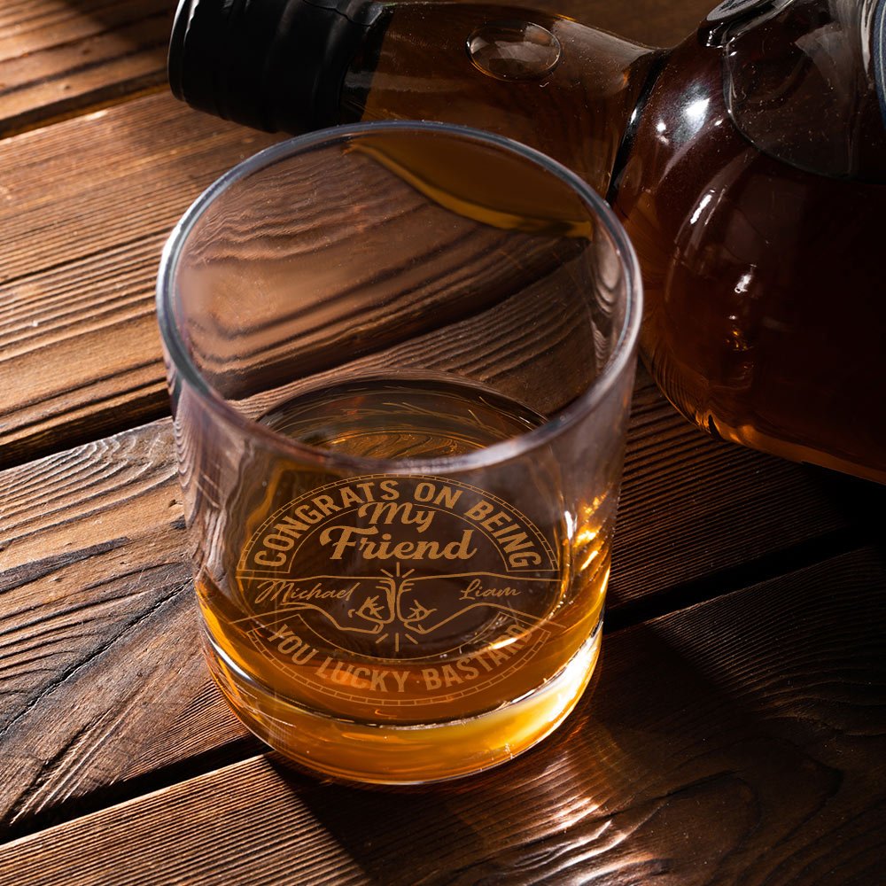 This whisky glass is printed with the words "CONGRATS ON BEING". You can customize the name and title below according to your needs. The text "YOU LUCKY BASTARD" at the bottom conveys a kind of intimacy and humor. The fist bump pattern adds a sense of tacit understanding and friendship.