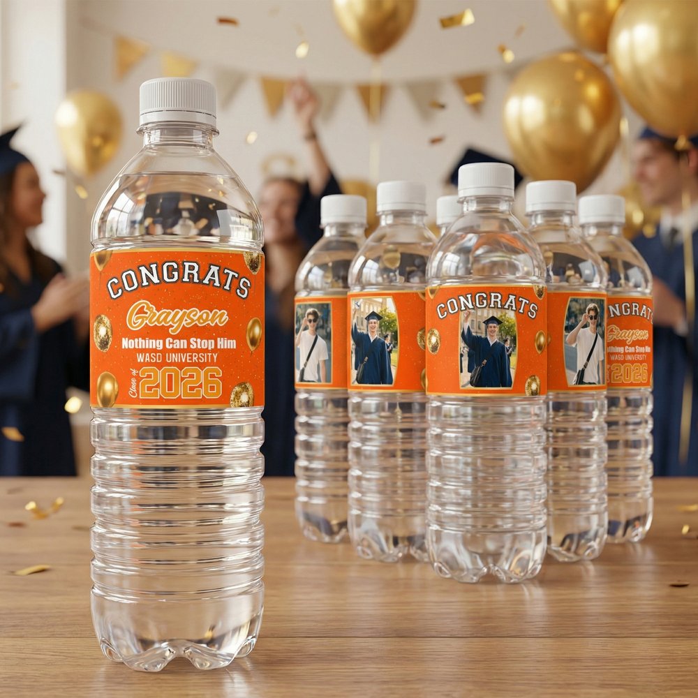 These custom water bottle labels are exclusively designed for graduates, serving as a one-of-a-kind decoration for graduation ceremonies and parties. Ideal for dressing up party tables and beverages, they add a special touch of ceremony to graduation celebrations and make lovely little souvenirs for guests to take home.