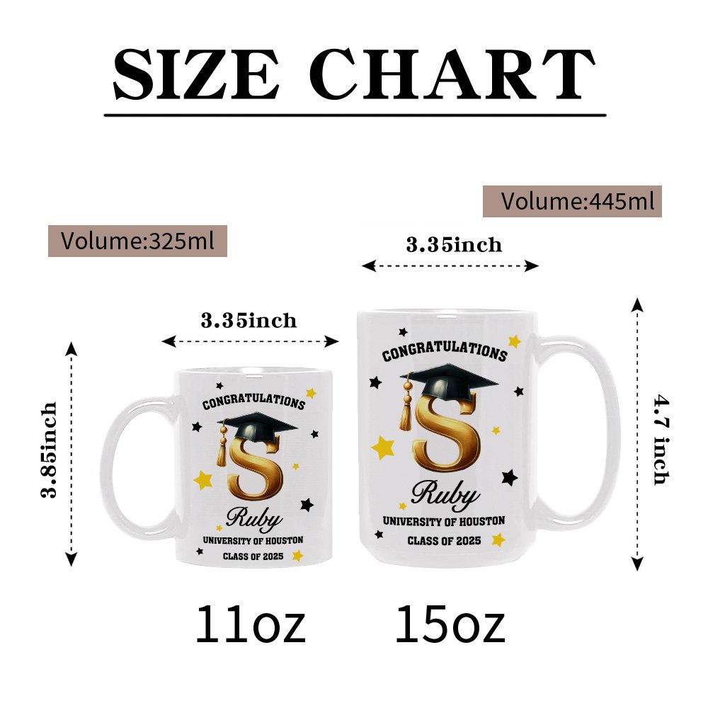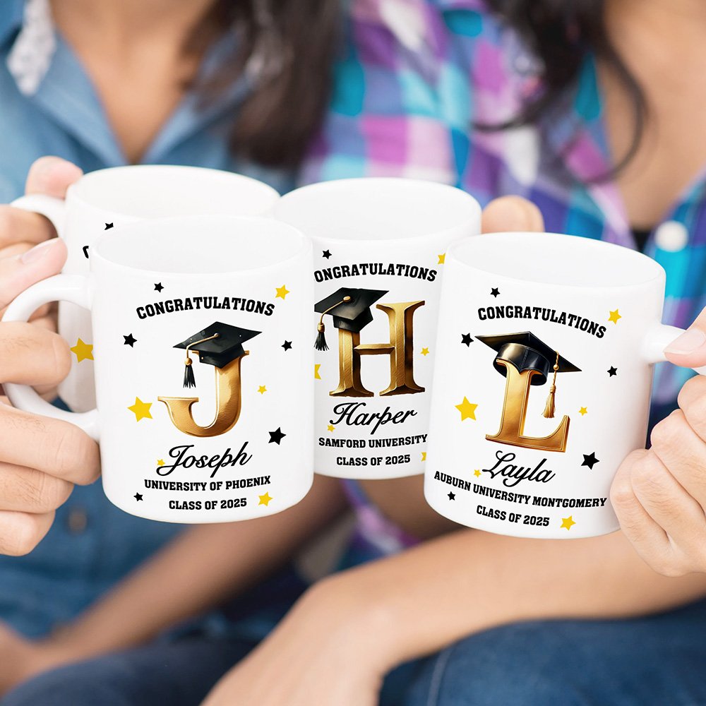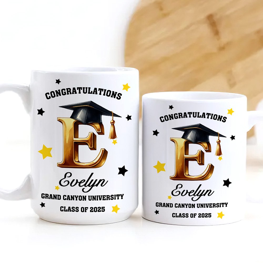 This mug features a gold and black star background with customizable graduation cap Initials and can be customized with your name, school name, and graduation year. It makes a unique gift for any graduate.