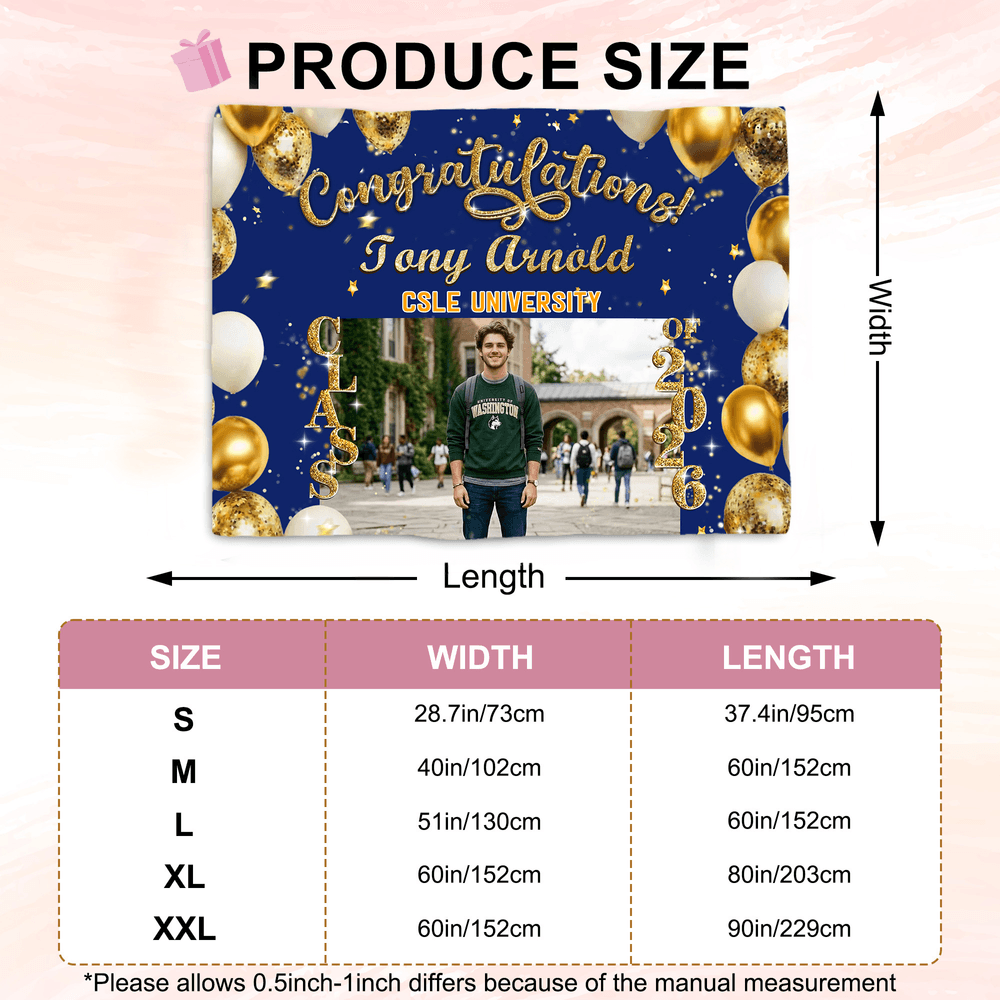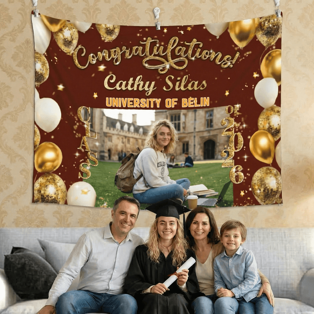 Designed with a graduation theme, this tapestry supports customization with photos, names, and school names, making each piece truly one of a kind. Every tapestry is specially created to preserve the graduate’s cherished memories. Multiple colour options are available, allowing you to match the decoration with the graduation party theme, personal style, or school colours, creating a bright and eye-catching graduation display.