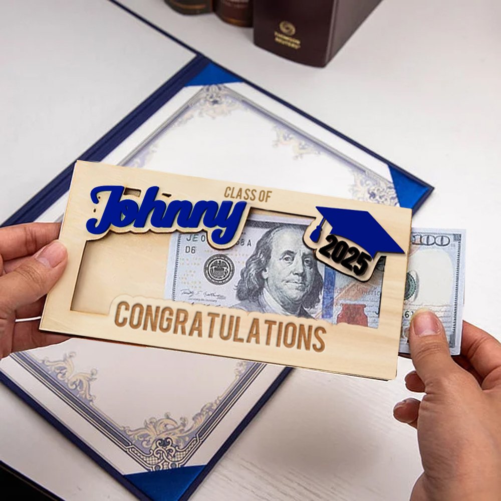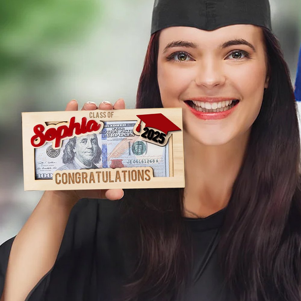 This Personalized wooden money holder features a stylish graduation cap design along with the words "Congratulations." Customizable with their name and graduation year, it serves as a lasting keepsake to honor this significant milestone in their lives.