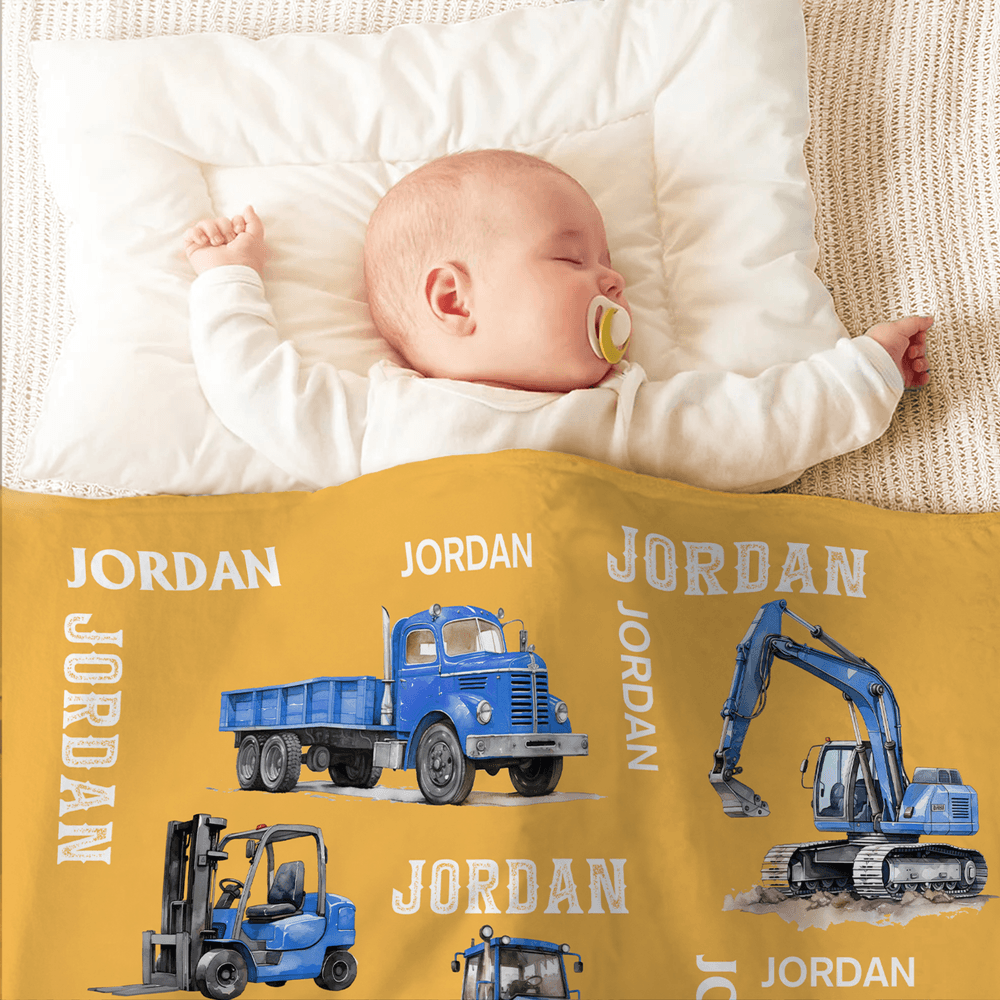 This personalized blanket features a unique design showcasing some engineering vehicles along with your child's name. It’s a special keepsake that makes every cuddle session memorable, celebrating your child's individuality and passion for engineering.