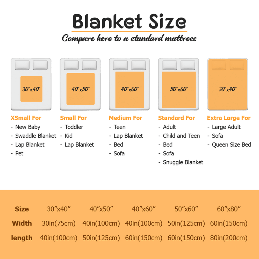 | Measurement: | Fleece Blanket - 30" × 40"(75cm × 100cm), 40" × 50"(100cm × 125cm), 40" × 60"(100cm × 150cm), 50" × 60"(125cm × 150cm), 60" × 80"(150cm × 200cm), Sherpa Blanket - 40" × 50"(100cm × 125cm), 50" × 60"(125cm × 150cm), 60" × 80"(150cm × 200cm) |