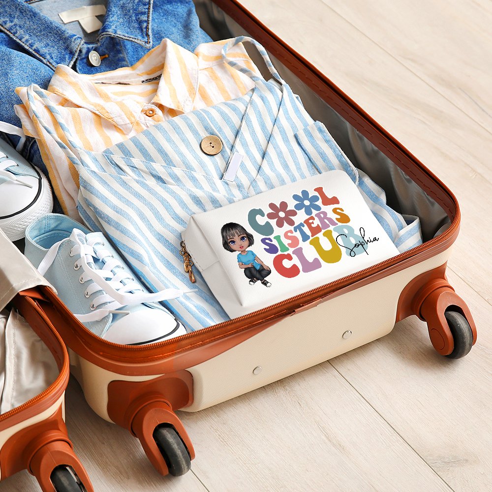 Personalized Cool Sisters Club Cartoon Character Leather Makeup Pouch Bag with Name Portable Travel Essentials Birthday Bridesmaid Gift for Women Girl