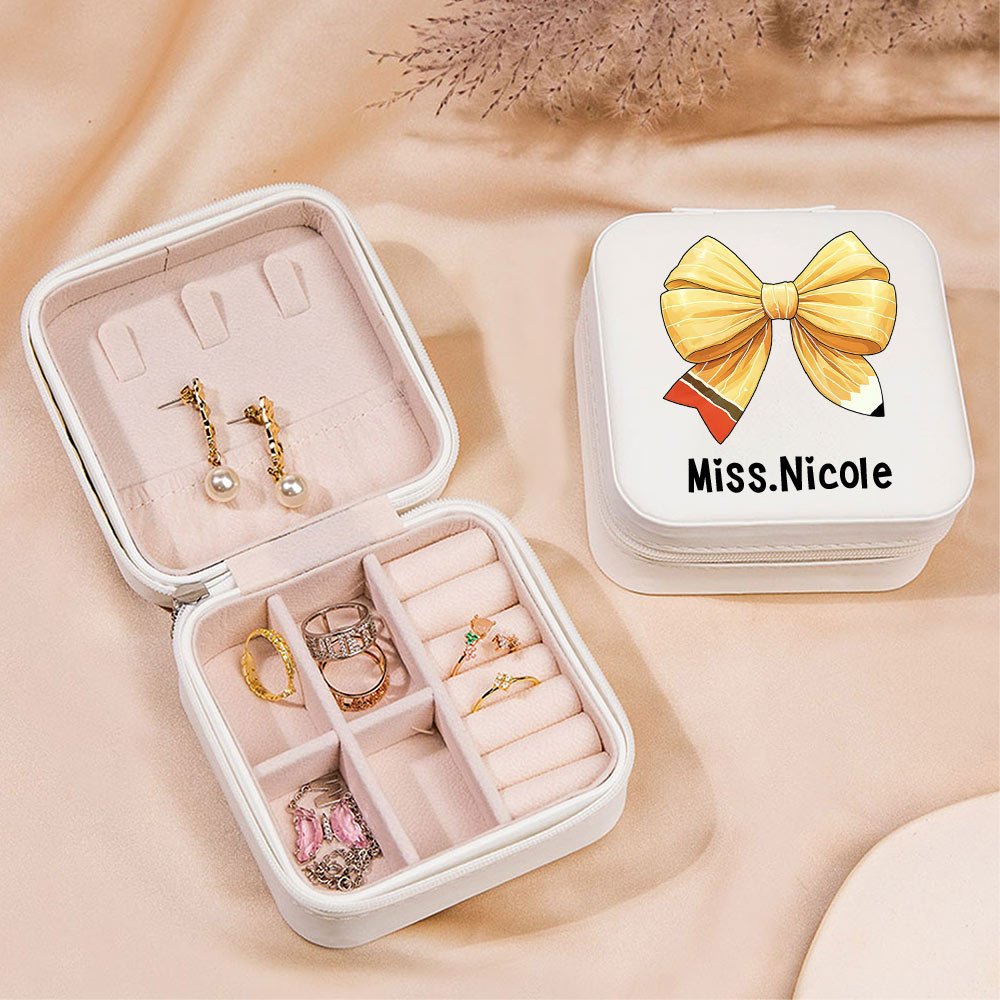 Our jewellery box is designed with a charming coquette pencil bow and can be customized with a teacher's name. It is a perfect gift for teachers.