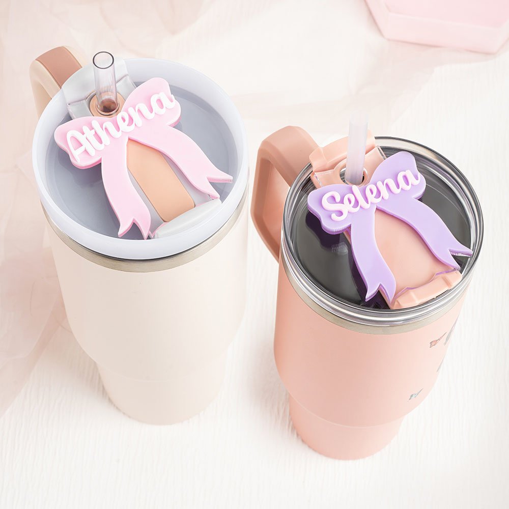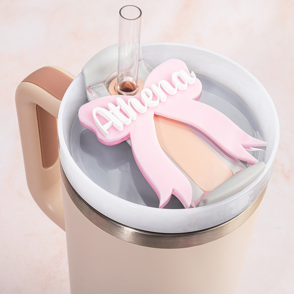 Our tumbler lid topper features a beautifully crafted bow design that exudes elegance and romantic charm. You can customize it with the colour and a Personalized name, making it a unique accessory that reflects individual personality and style.