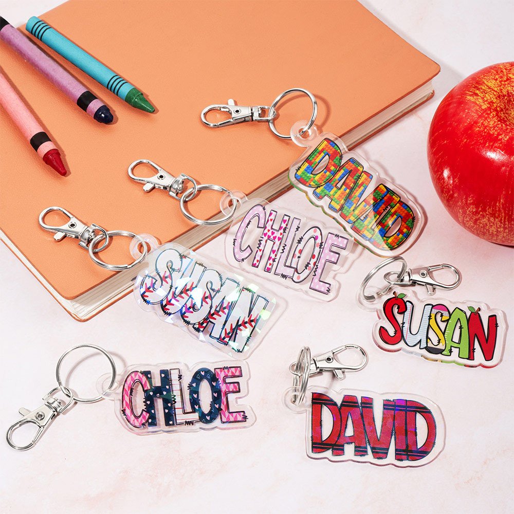 Personalized Crayon Flower Doodle Letters Acrylic Keychain with Name and Card Birthday Back to School Christmas Gift for Kids Teacher