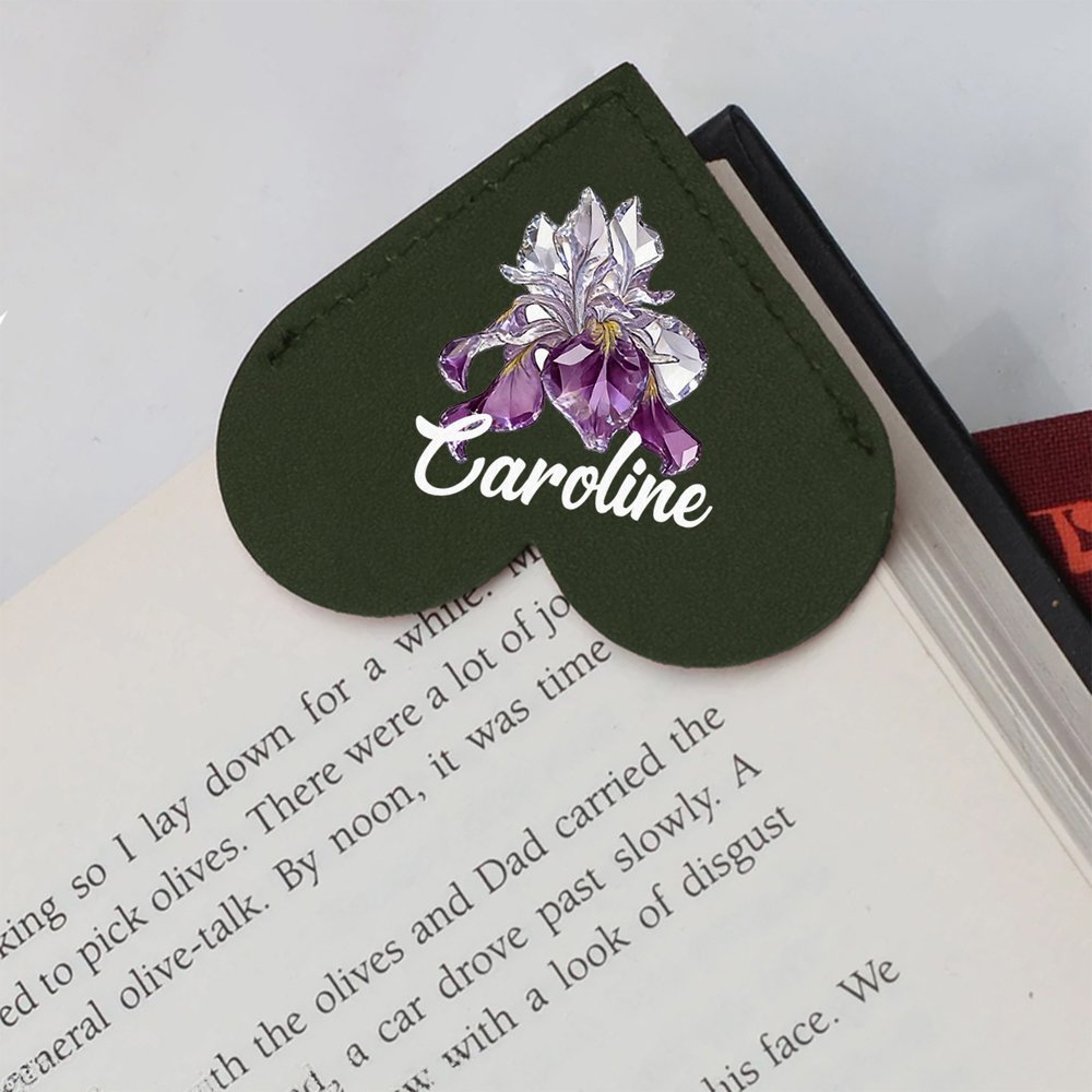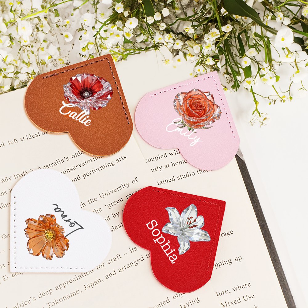 Personalized Crystal Birth Flower PU Leather Heart Corner Bookmark with Name Reading Birthday Gift for Book Lovers Bookworms