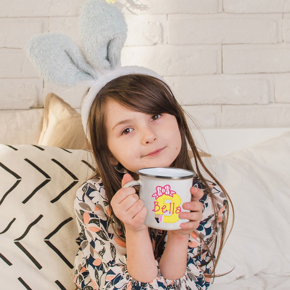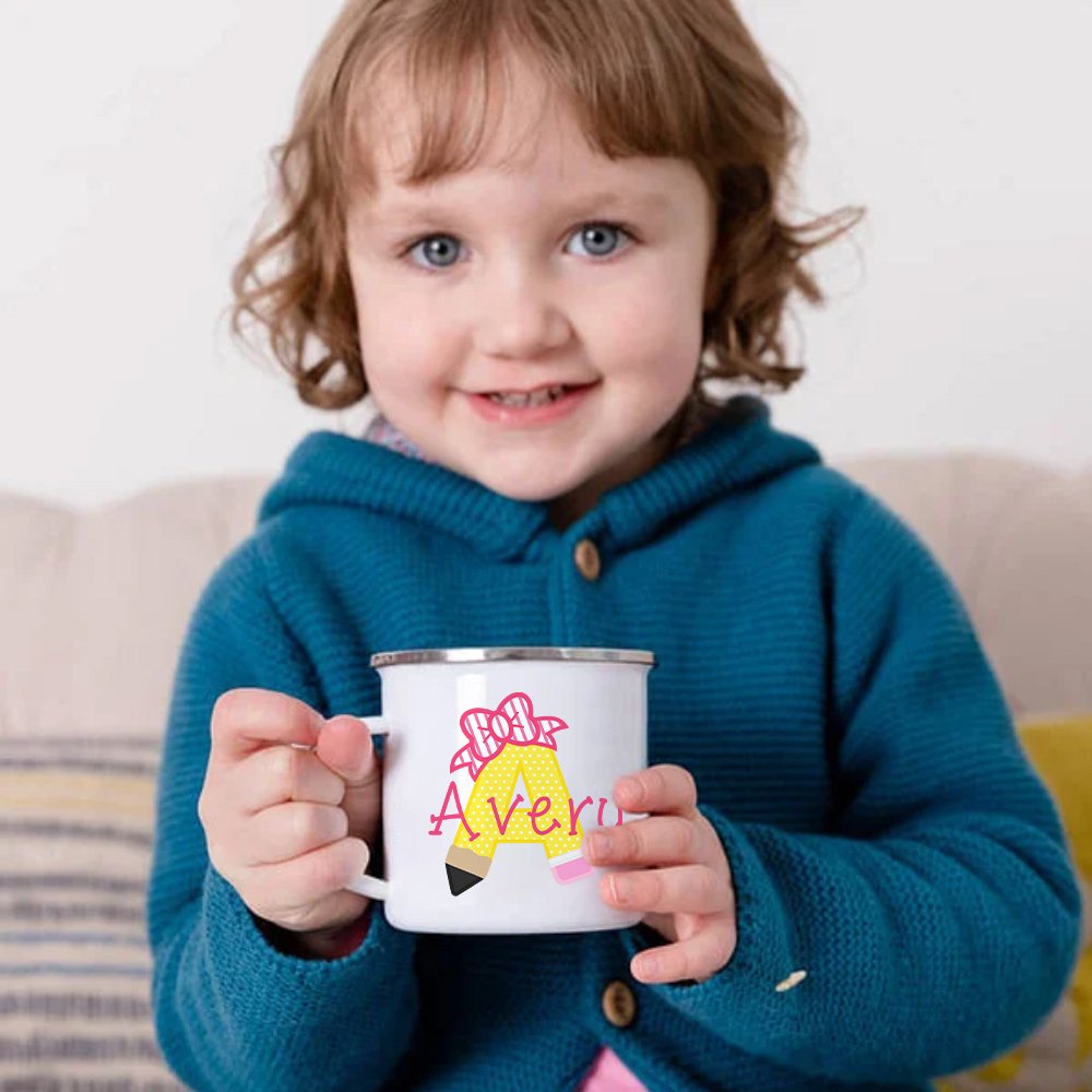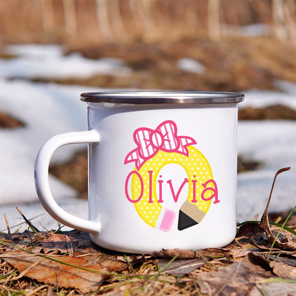 This enamel mug is printed with a playful pencil initial or bow pencil initial. Each enamel mug can be Personalized with your child's name to create a unique back-to-school essential.