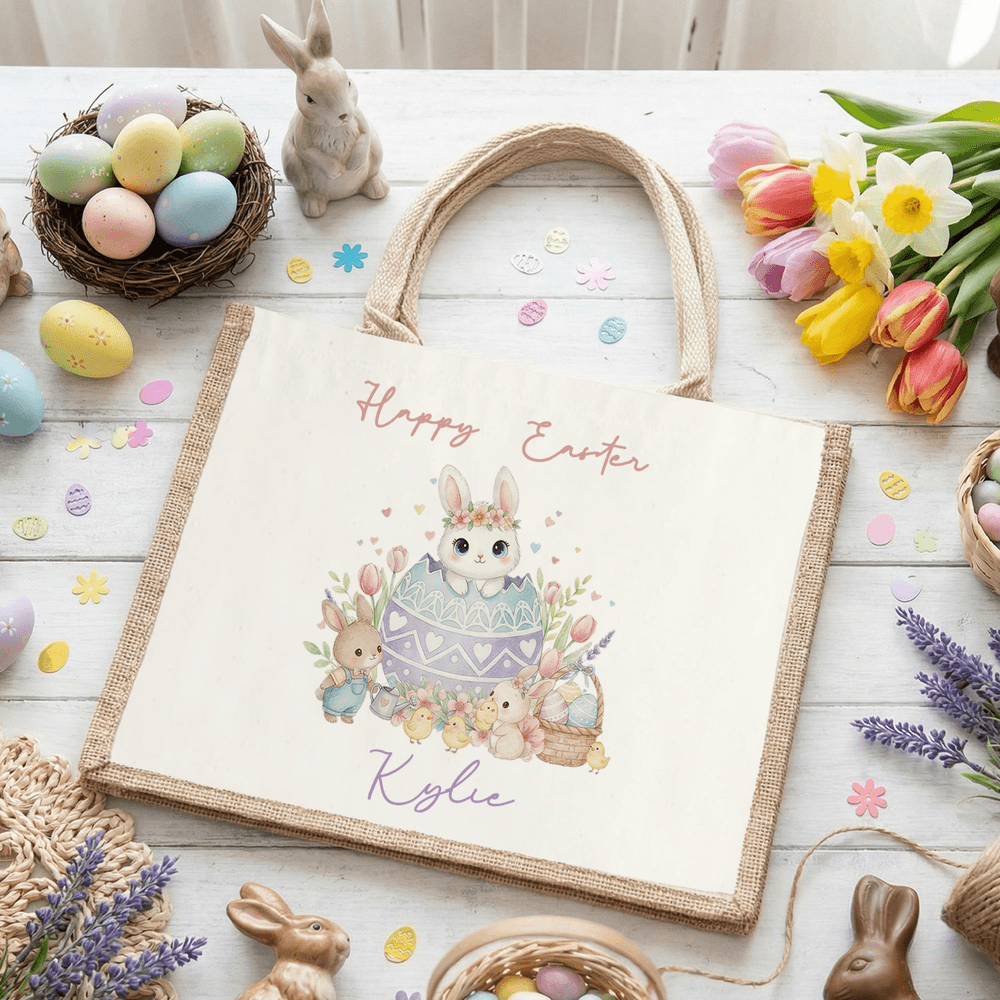 This jute tote features a charming bunny peeking from a colourful eggshell as the focal motif—playful, vibrant, and instantly appealing to kids and parents. The artwork can be personalized with a name and a “Happy Easter” header, adding a touch of whimsy and a strong sense of ownership. Perfect as an Easter egg‑hunt sack or a cheerful everyday tote, it brings a delightful festive accent to any setting.