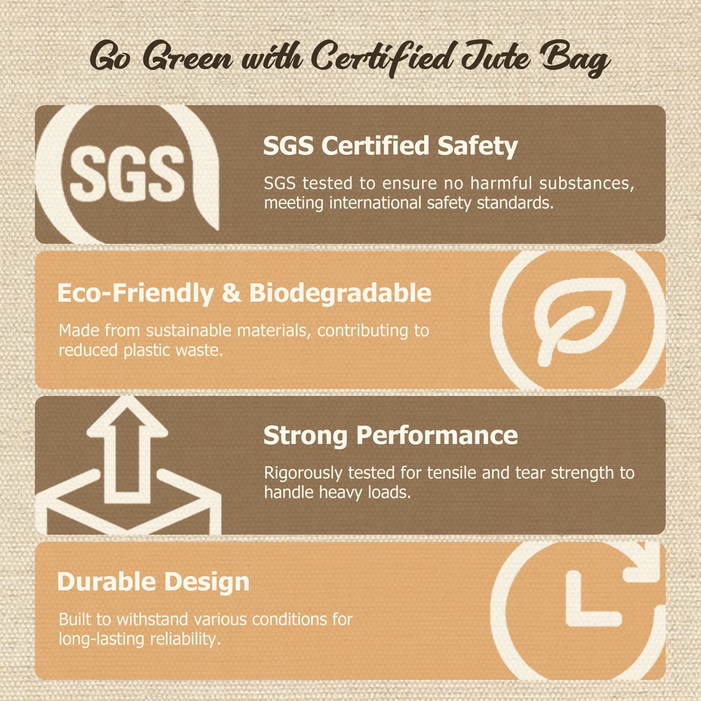 Crafted from durable, eco-friendly jute fabric, this tote is built to withstand repeated use while reducing reliance on single-use paper or plastic bags. The natural jute material offers high tensile strength and excellent durability, with a textured, rustic appearance that ages beautifully over time. It is lightweight yet sturdy, with reinforced handles for comfortable carrying.