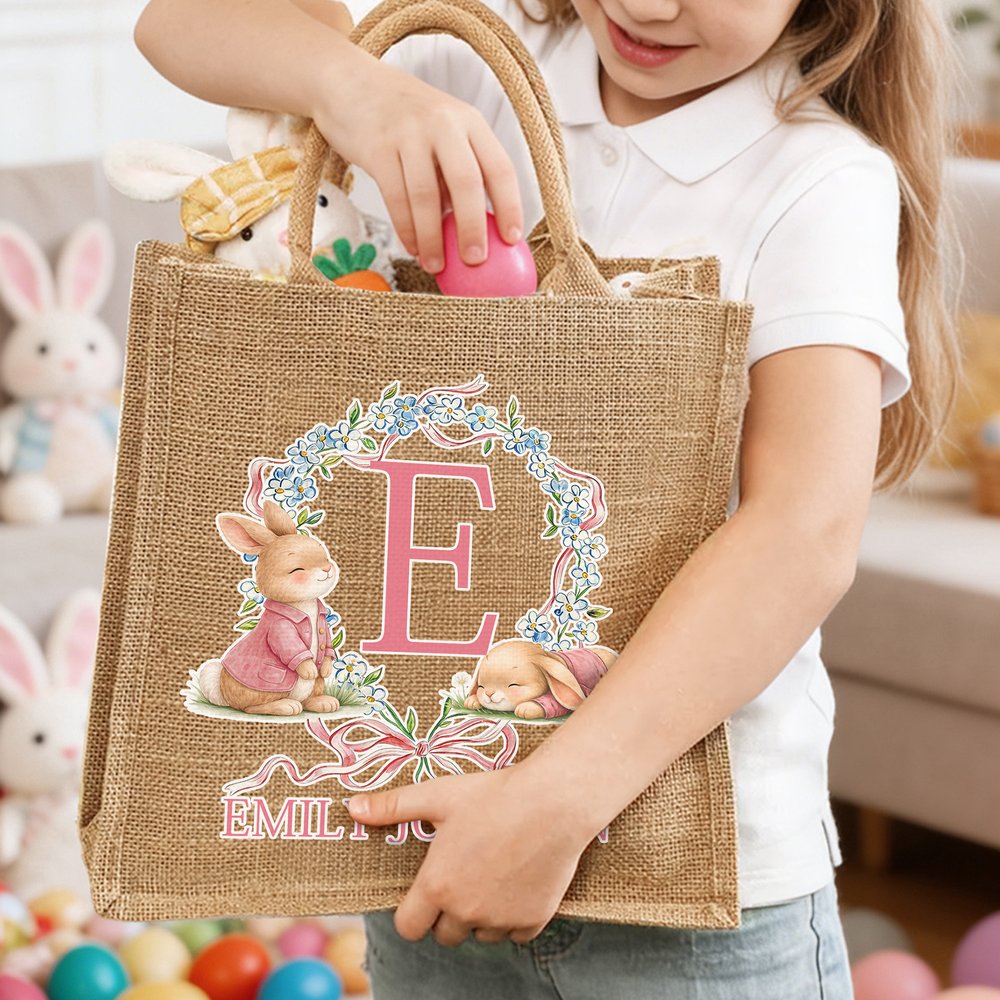 The tote features a warm, rustic aesthetic with a natural jute base and vibrant watercolour-style illustrations of Peter Rabbit. The design centres on a large initial framed by a delicate floral wreath, with your child’s name printed below. This style blends Easter charm with eco-conscious design, resulting in a tote that feels both festive and timeless, sure to become a beloved part of your child’s Easter traditions.