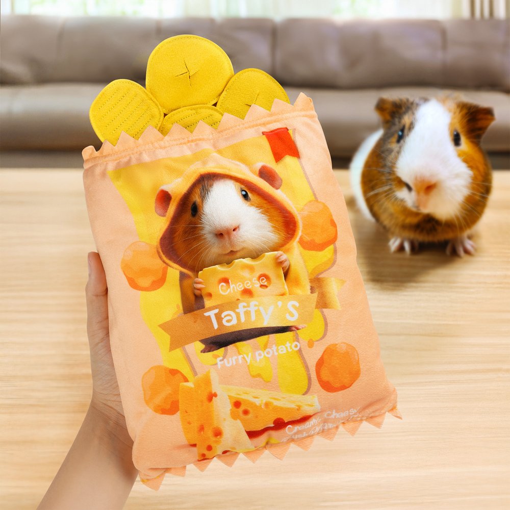 Inspired by the classic potato chip packaging, this guinea pig nest uses three-dimensional simulation modeling to create a perfect replica of the folded texture and opening design of the potato chip bag. When the guinea pig rests in the nest, it looks like a "plush potato" stealing potato chips, creating a vivid and interesting scene of cute pet life. Bright snack packaging with cartoon elements, both full of childish fun, can attract guinea pigs to explore, adding infinite fun to the lives of pets. Our team will transform your uploaded pet photos into adorable cartoon avatars, adding a personalized element to show off your guinea pig's unique personality.