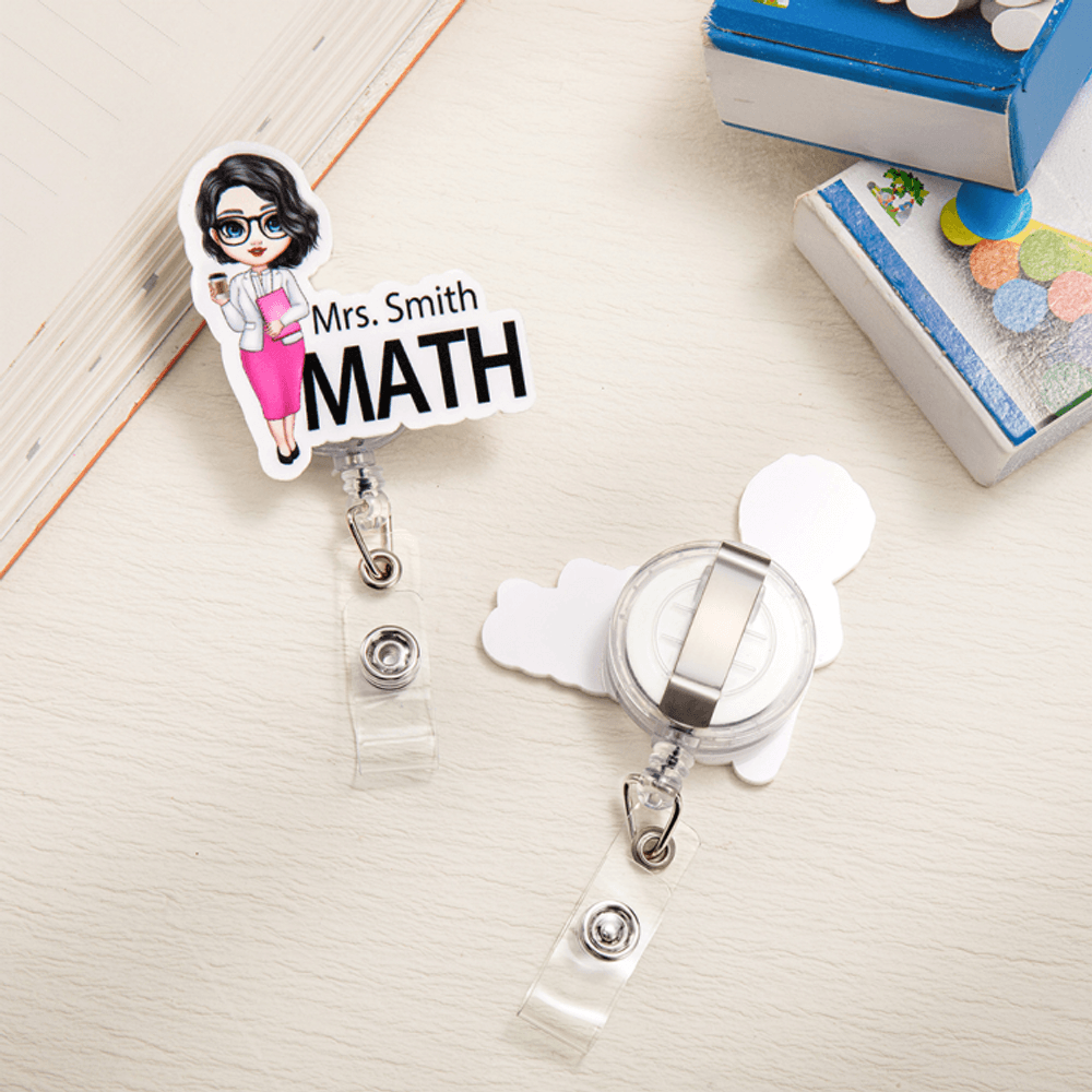 Personalised Cute Cartoon Character Acrylic Retractable Badge Reel with Name and Subject Back to School Teacher's Day Birthday Gift for Teachers