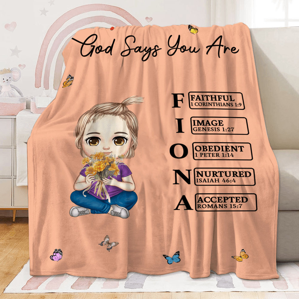 This design beautifully merges faith and personality with a "God Says" theme—each letter of a name corresponds to a Bible verse. It features a charming cartoon character holding a birth flower bouquet, accented with delicate butterflies. Choose your preferred background colour and custom name for a truly personal expression of belief.