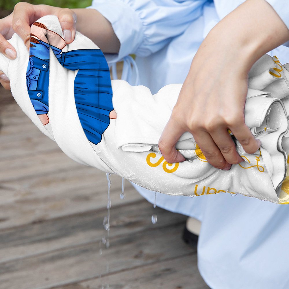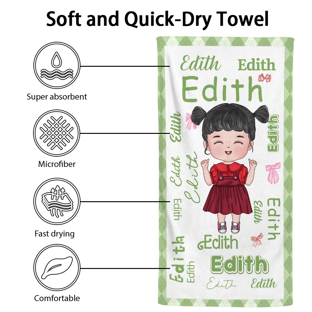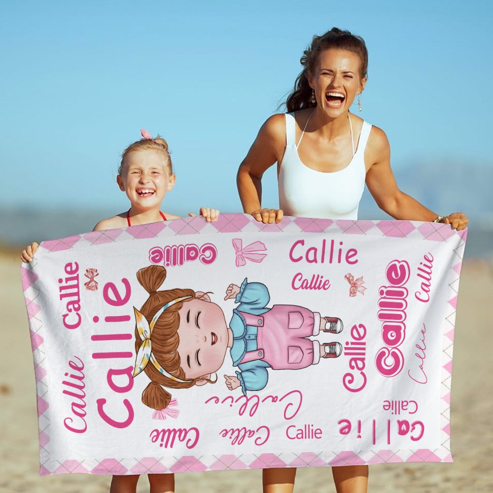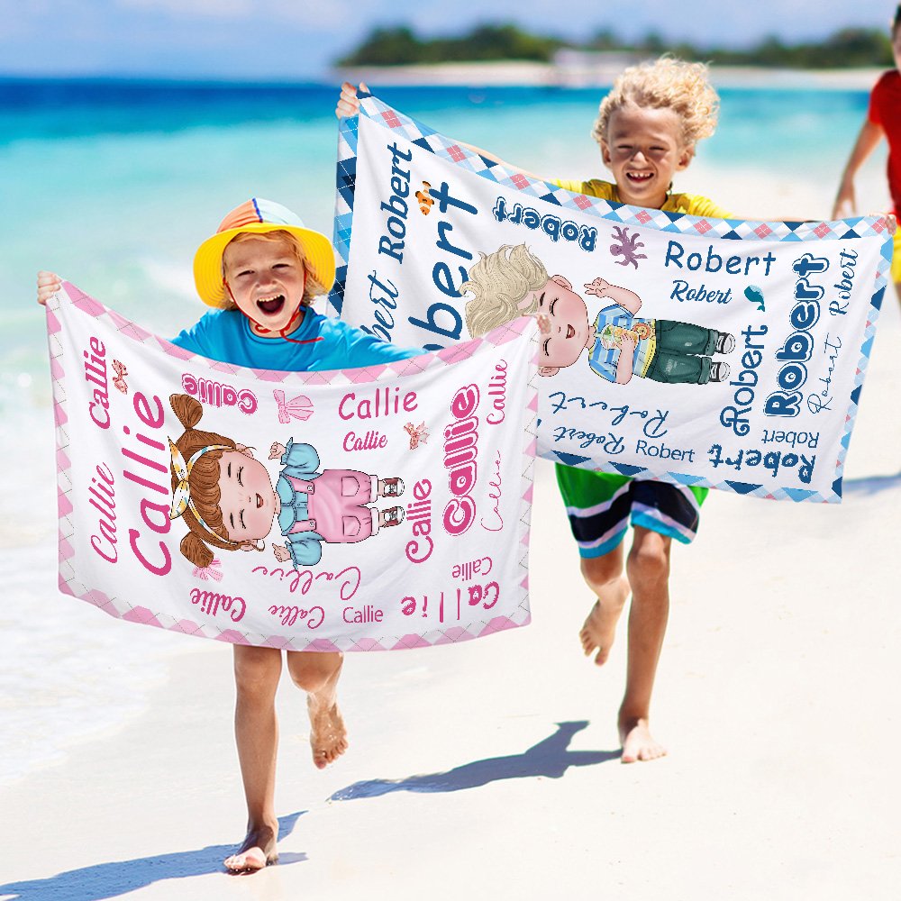 This beach towel features a word cloud name and cute cartoon character design. Users can Personalise their gender, hairstyle, hair colour, clothing, skin colour, and eye colour. Not only are there 8 diamond checker patterns for you to choose from, but you can also choose a bow or marine life pattern, which is full of childlike innocence and your children will definitely love it.