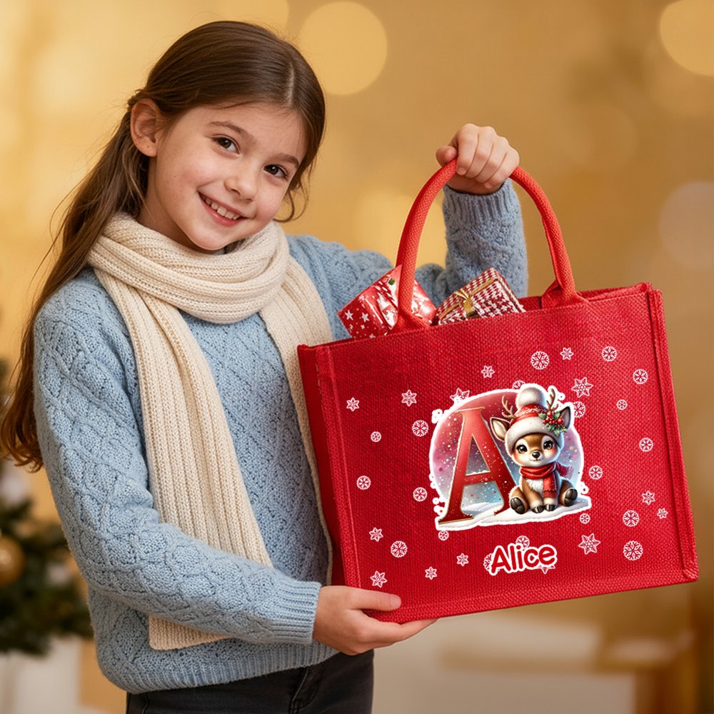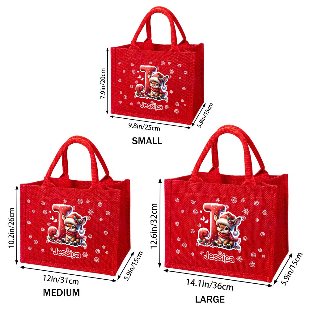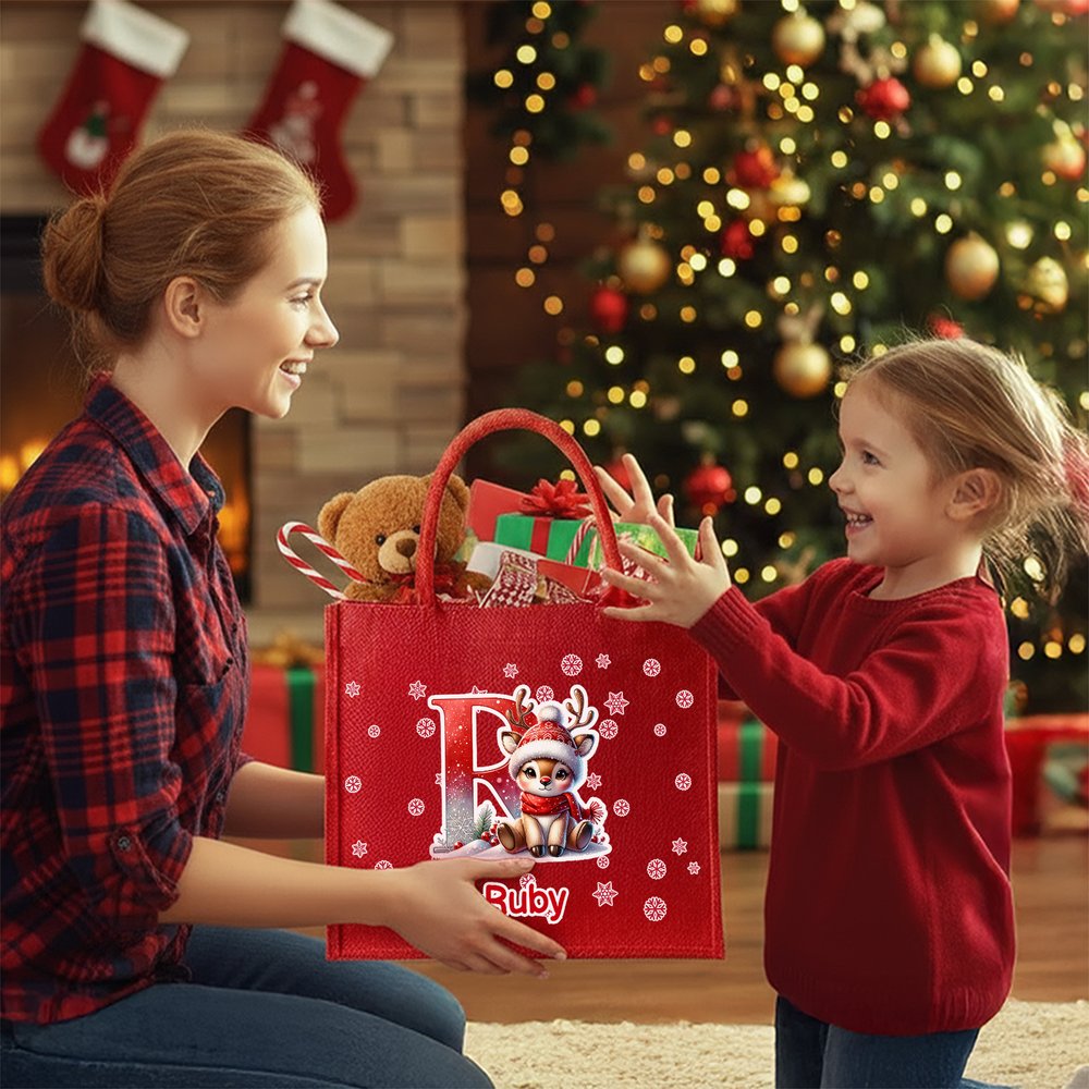 Featuring a vibrant, festive red base, the bag instantly creates a festive atmosphere. Large, eye-catching Christmas letters appear on the front, perfectly blending in with the adorable reindeer design. The reindeer, wearing a Santa hat and with a lively gaze, seems to be spreading holiday cheer. Dotted with white snowflakes, the design adds a touch of winter romance. Even more special, it can be customized with your own name, making it one-of-a-kind.