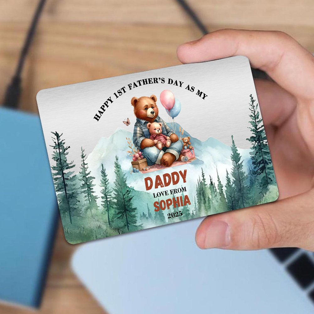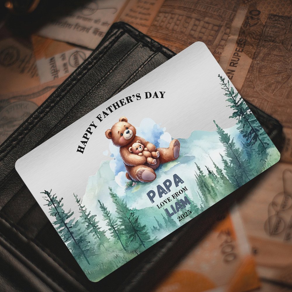 Featuring a warm illustration design, this wallet card depicts a cute father bear and his little bear sitting in a mountain view, conveying a strong sense of family affection. The card is printed with a fixed title of "HAPPY FATHER'S DAY" or a custom title, and you can also customize your name and your child's name to make it a unique souvenir.
