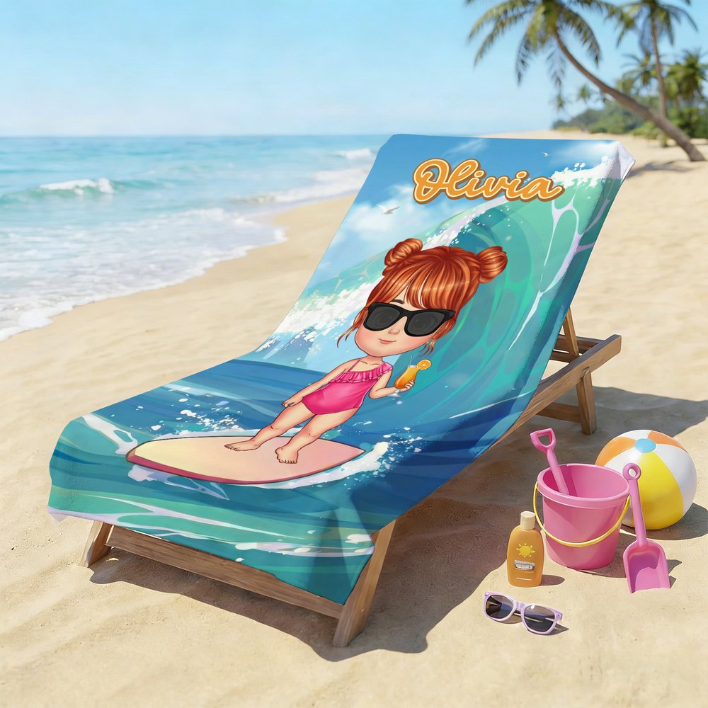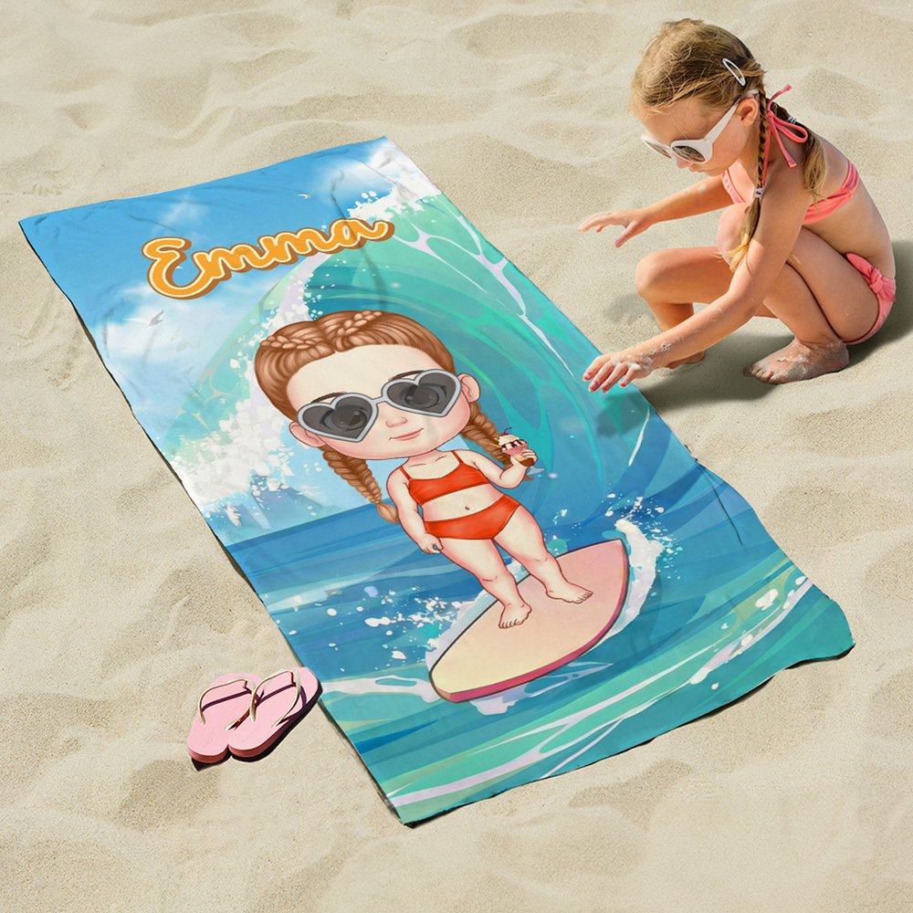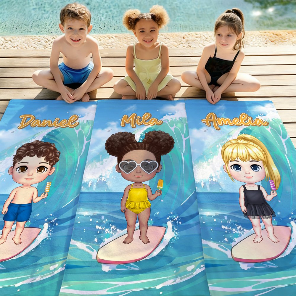 Featuring surfboards and children's summer characters, this beach towel can be customized with a name. Bright and vibrant colours exude summer energy, making your child the star of the beach.