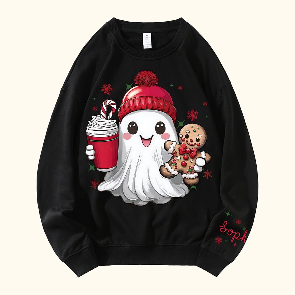 This sweatshirt features a charming Christmas hat ghost along with classic holiday elements like gingerbread men, Sweets canes, and snowflakes. These festive designs bring the joyful spirit of Christmas to life, making it a fun and trendy choice for the holiday season.