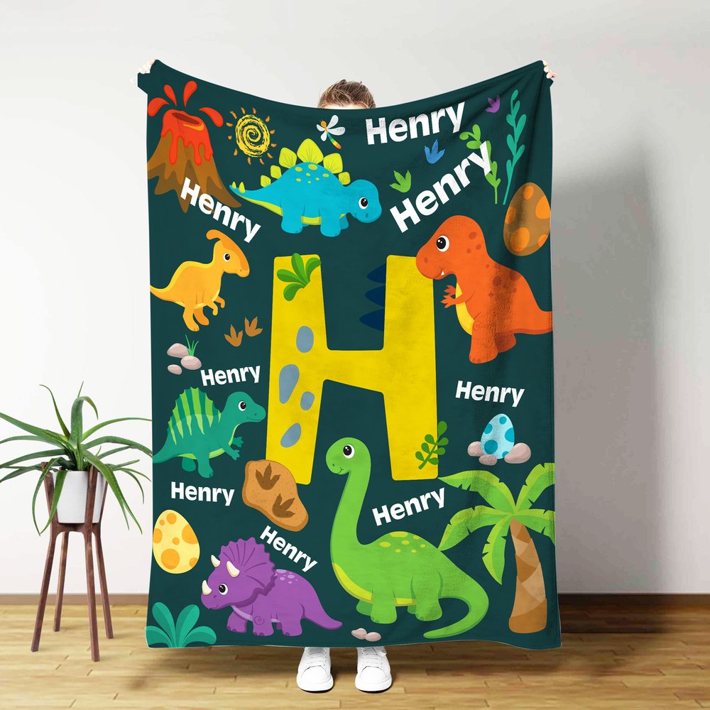 You can select from 19 vivid background colours (such as navy blue, coral, or violet) to match your taste. Opt for either “tree” or “flower” pattern themes. Choose a dinosaur-style initial from A to Z. Each letter boasts adorable dinosaur details. You can also add a name, tailor the blanket perfectly to a child or dinosaur enthusiast’s likes.