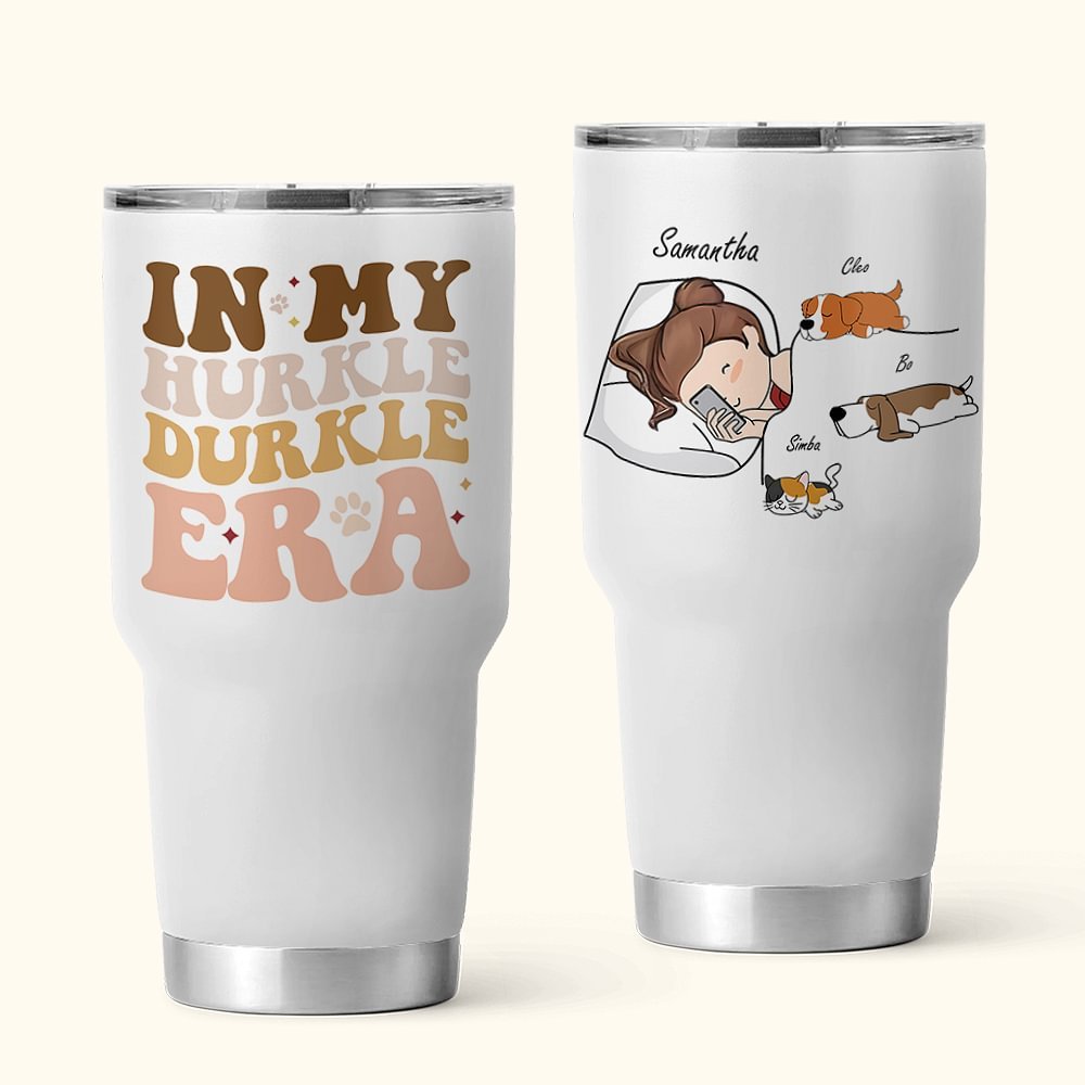 This 30oz tumbler is a delightful gift for pet lovers. It features the cute quote" In My Hurkle Durkle Era" and the option to customize names and cartoon images that showcase their love for their furry friends.
