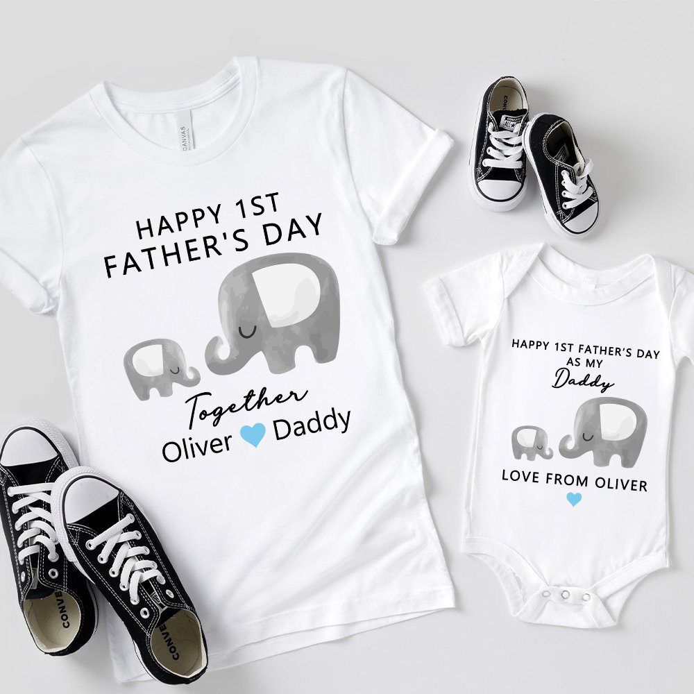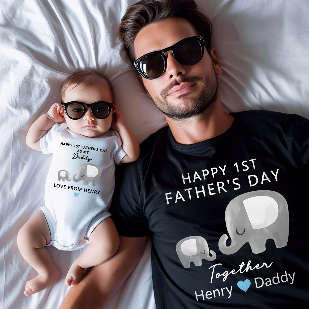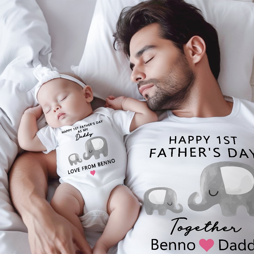 We have designed cute cartoon parent-child elephants on our garments to represent the father and the baby respectively. We use this warm and harmonious pattern to express the love between the father and the child, and the celebratory text of "Happy 1st Father's Day" adds a warm and festive atmosphere. We also offer the service of adding your and your child's name on the front of the garment. This customization service adds a personal touch and makes the garment more meaningful.