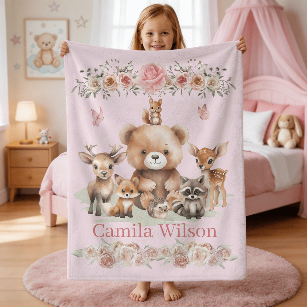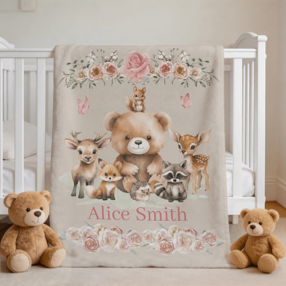 This blanket features an exclusive floral jungle animal illustration. Adorable forest friends, such as bears, deer, and foxes, are surrounded by delicate roses and butterflies, paired with a customizable name to create a one-of-a-kind, playful atmosphere.