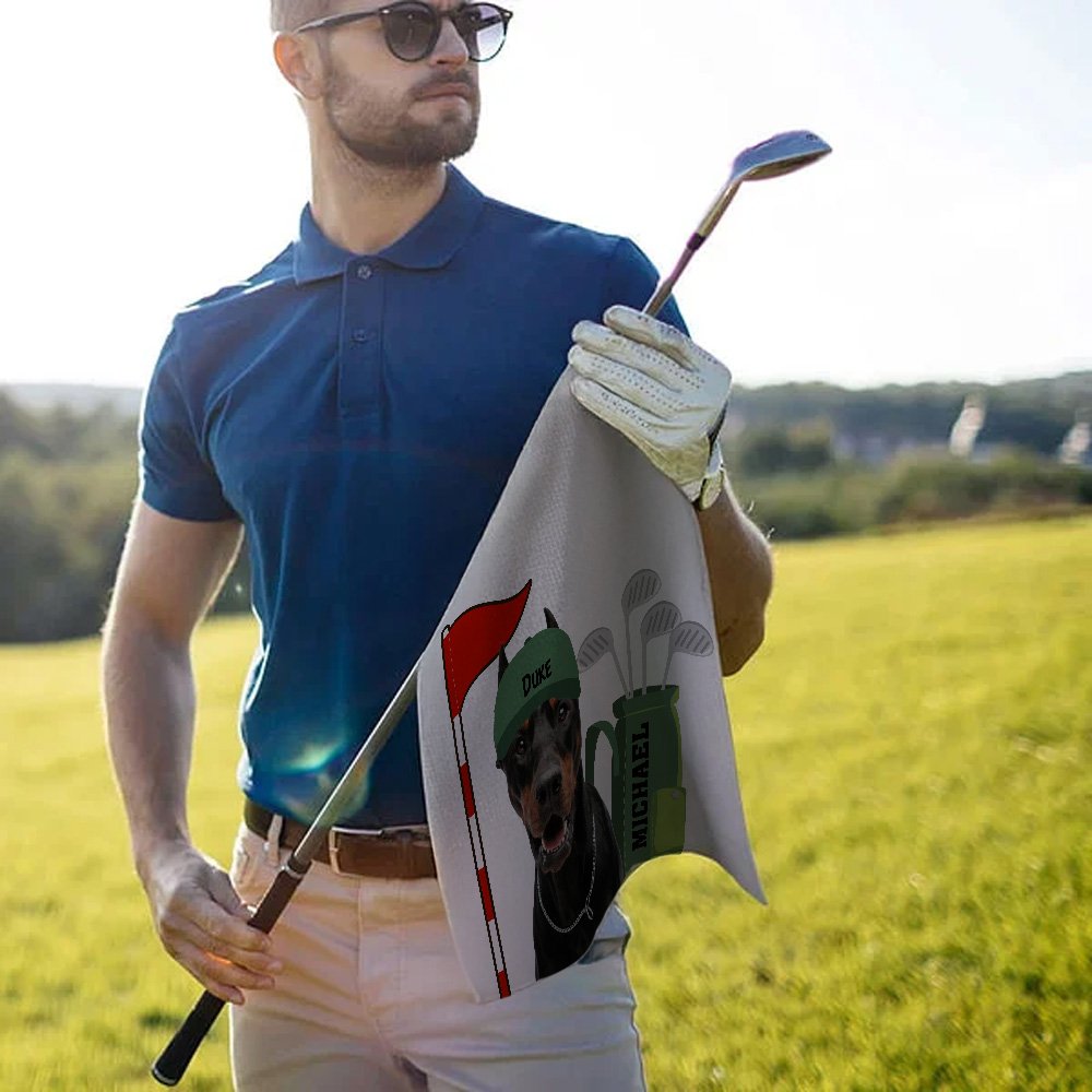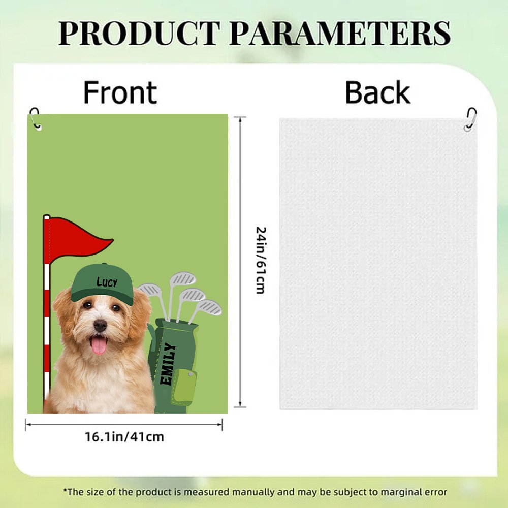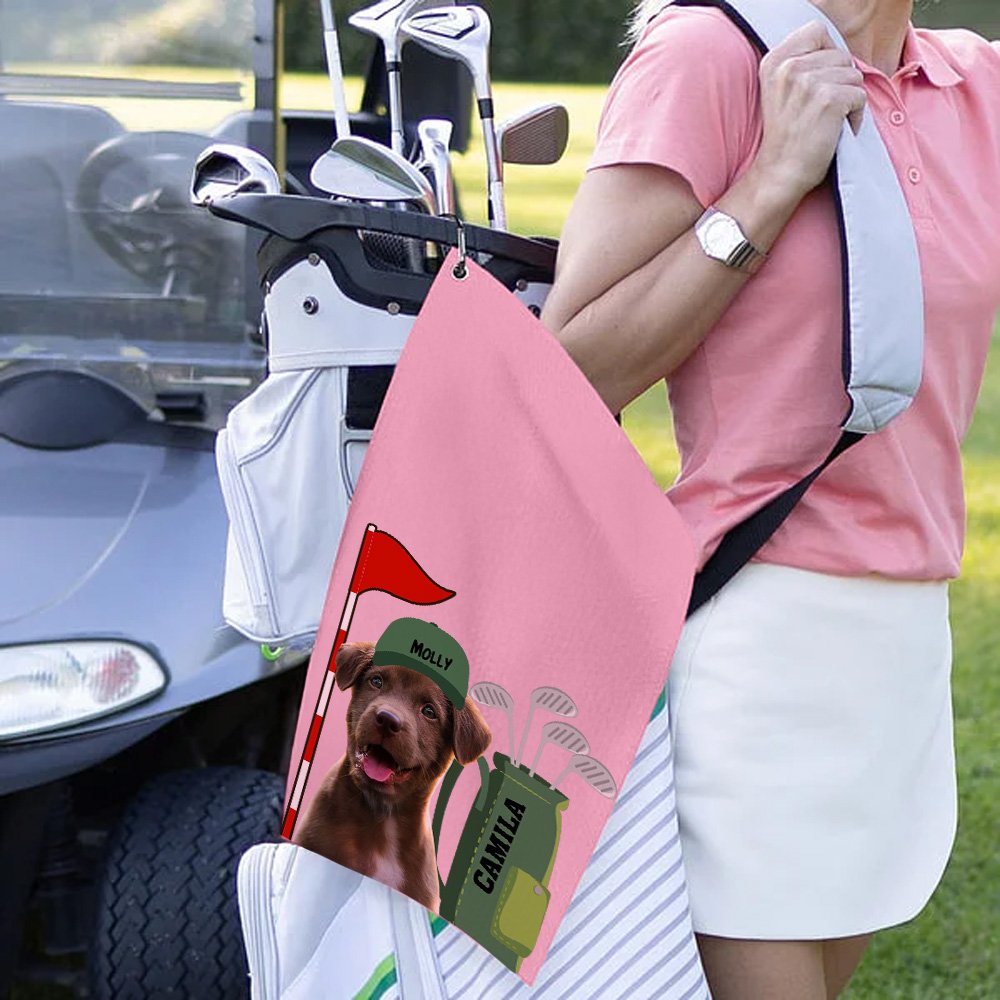 This golf towel features a playful design with cartoon golf clubs and a photo of your beloved pet, merging functionality with creativity and sentiment. You can customize it with a photo of your pet and include both your names, making this towel a unique symbol of your bond on the golf course and showcasing your close relationship with your furry friend.