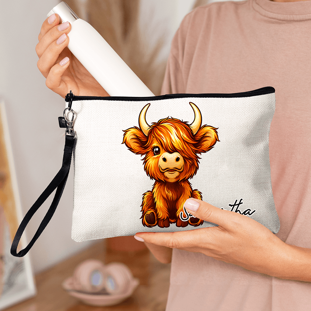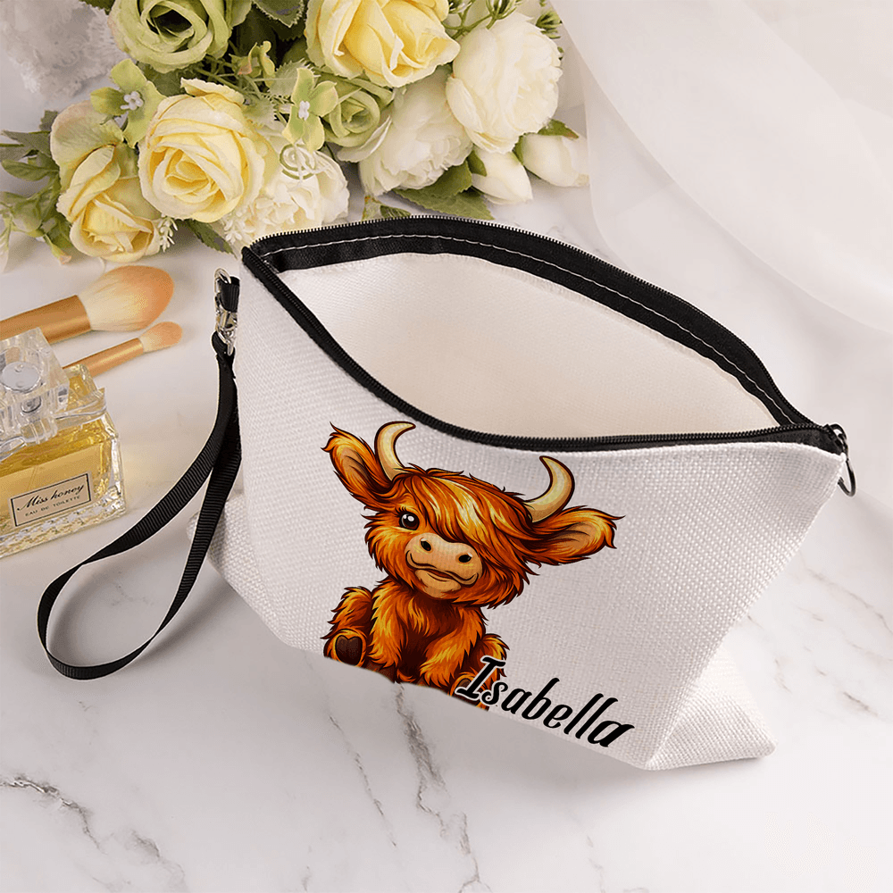 Personalized Cute Highland Cow Linen Makeup Bag with Name and Wrist Strap Birthday Gift for Highland Cow Lovers Women