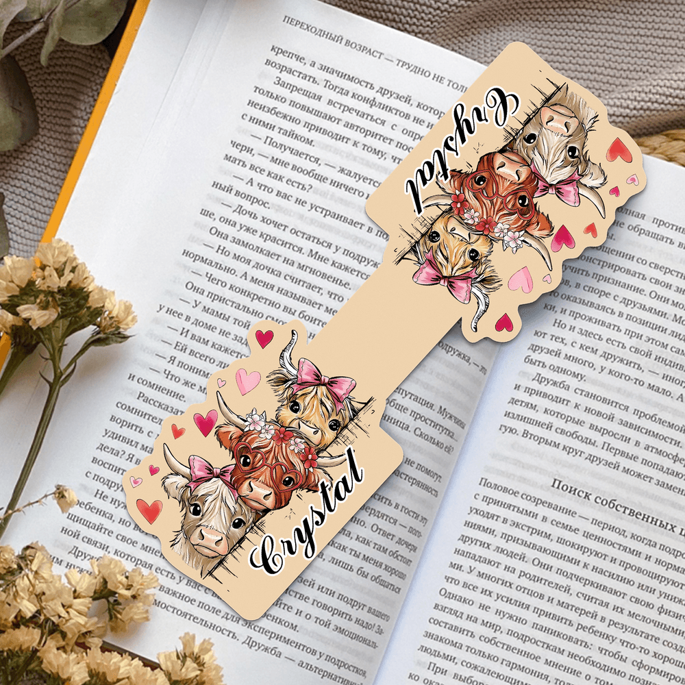 This adorable bookmark features a stack of fluffy Highland Cows with pink bows, hearts, or a cute floral crown, available in 12 soft macaron colours. It offers custom name personalization with 4 font choices, turning it into a unique, one-of-a-kind marker that reflects your style. The playful, whimsical design adds a sweet, cozy touch to every reading session.