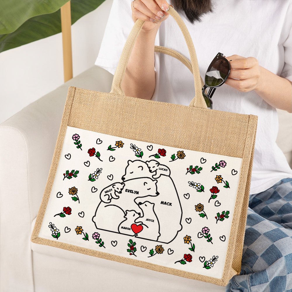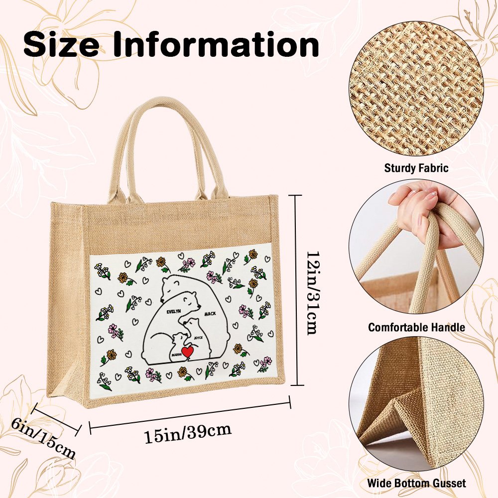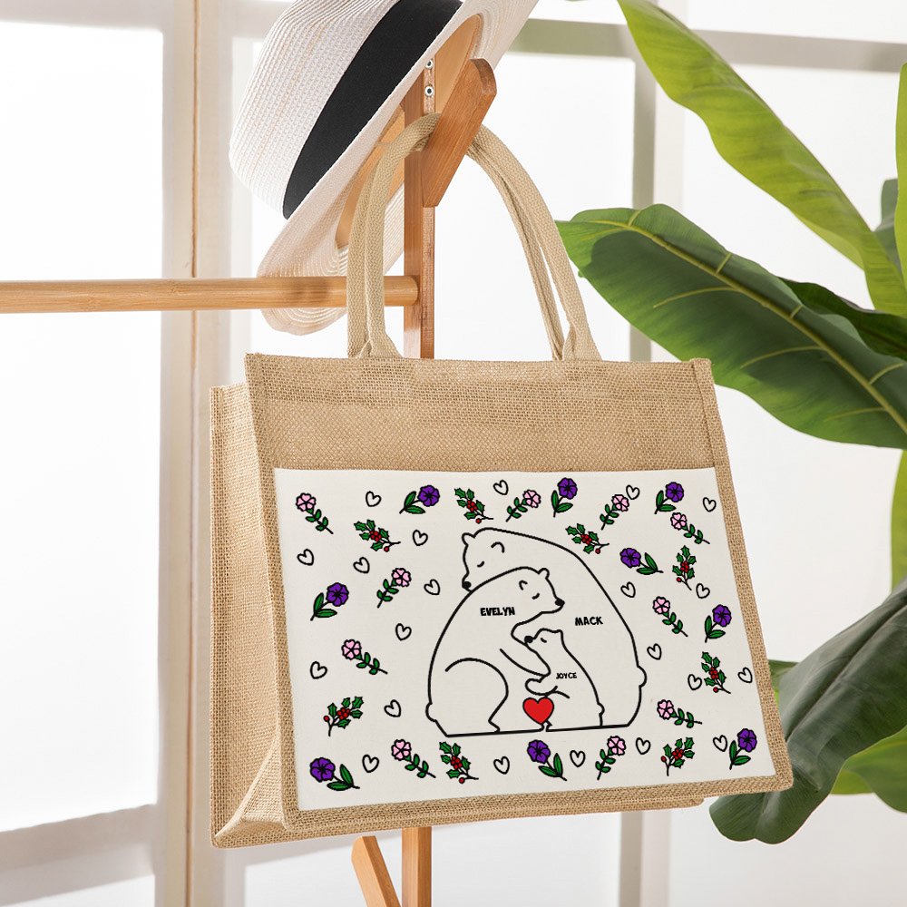 This jute bag features a family of bears hugging each other, surrounded by flowers and hearts, symbolizing a loving family. You can customize 2-9 bears, each with a name and corresponding birthday flowers to remind you that love and support keep your family together in good times and bad.
